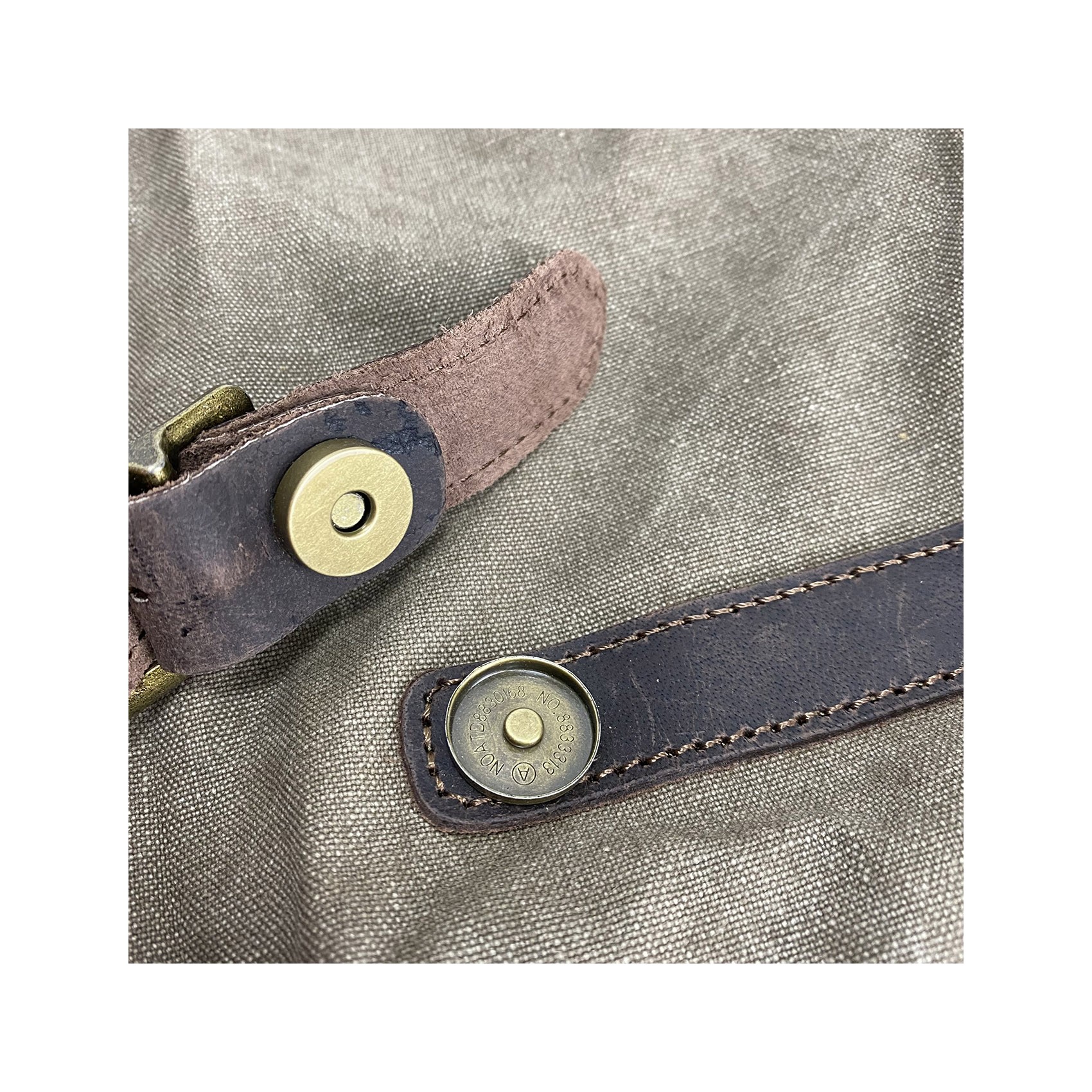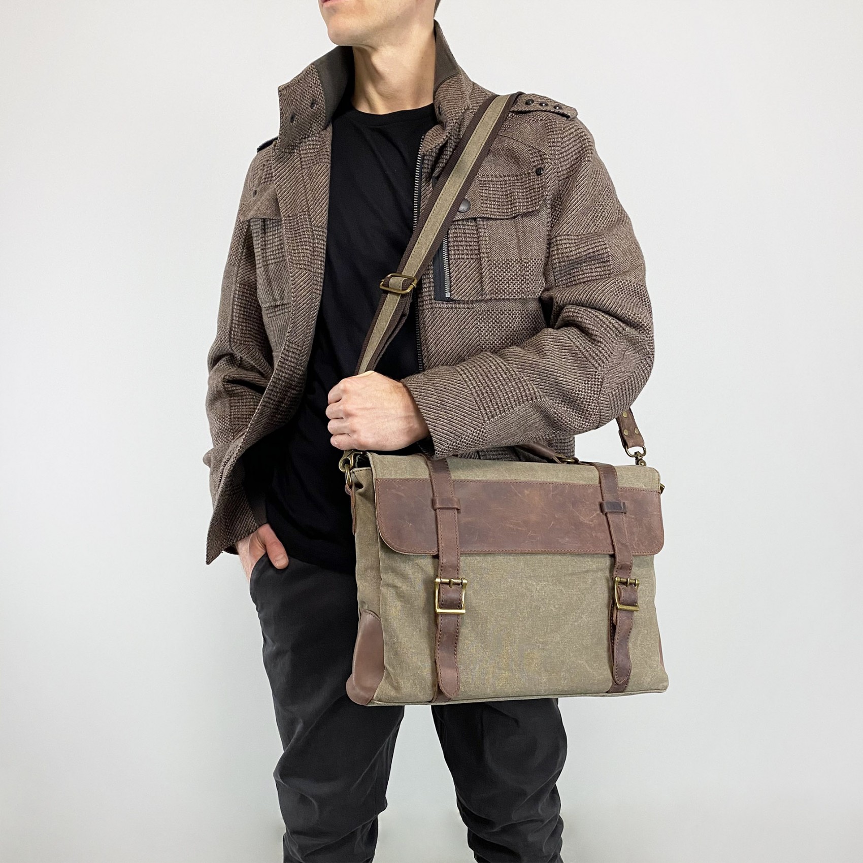 Эта сумка-портфель совмещает в себе стиль и функциональность. Изготовлена из конваса и натуральной винтажной кожи, подходит для ноутбука размером до 14 дюймов. Основное отделение закрывается на молнию и дополнительно фиксируется четырьмя кнопками-магнитами. Внутри есть перегородка с карманом на молнии, а также дополнительные карманы для мелочей и отделения для ручек. На обратной стороне расположен большой карман на молнии. В комплекте идет длинная ручка через плечо, которую можно отстегнуть при необходимости.