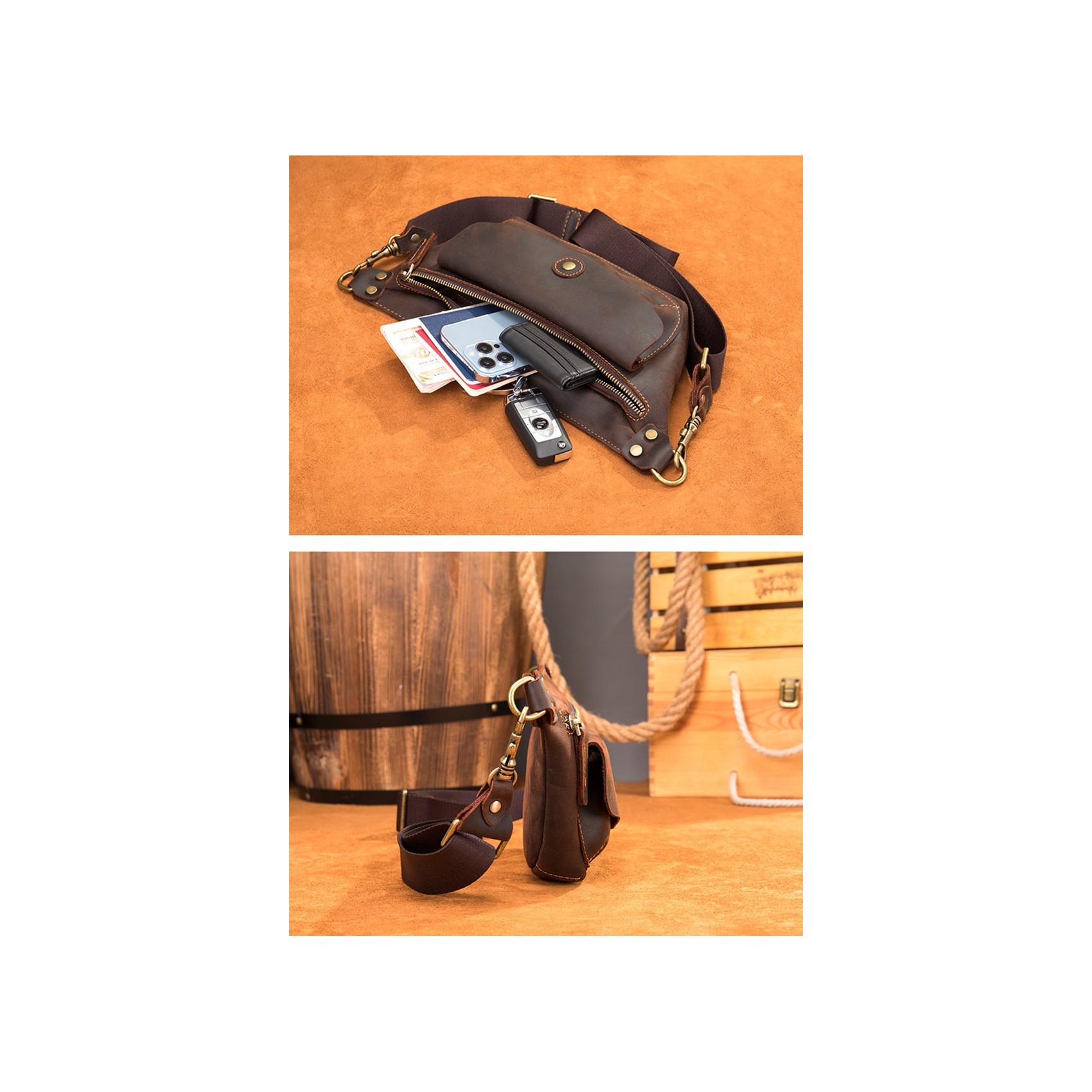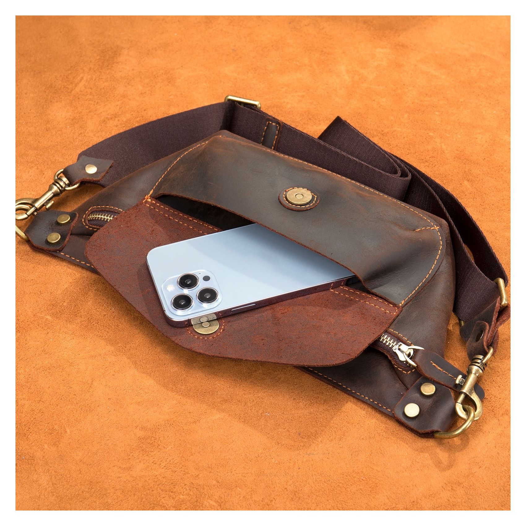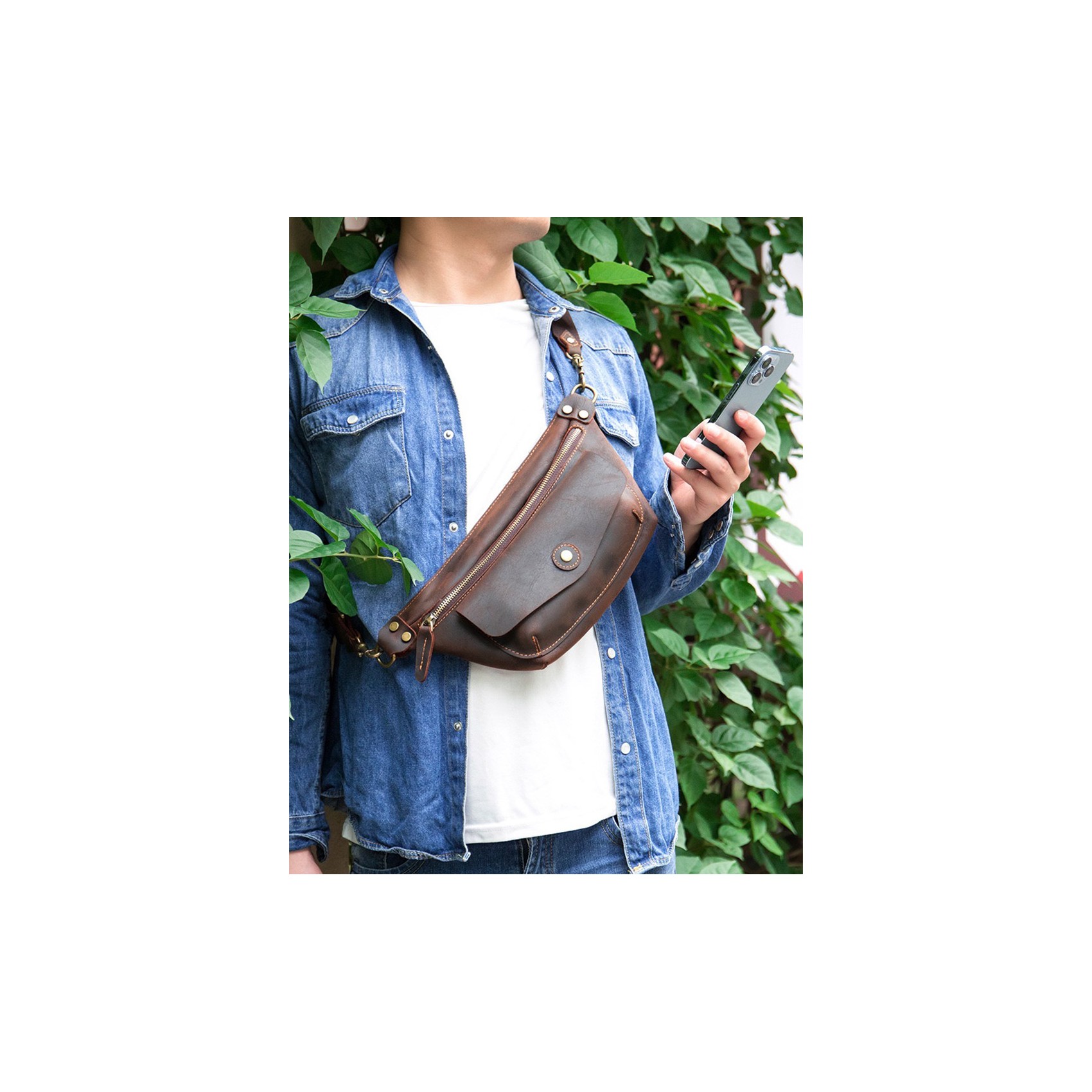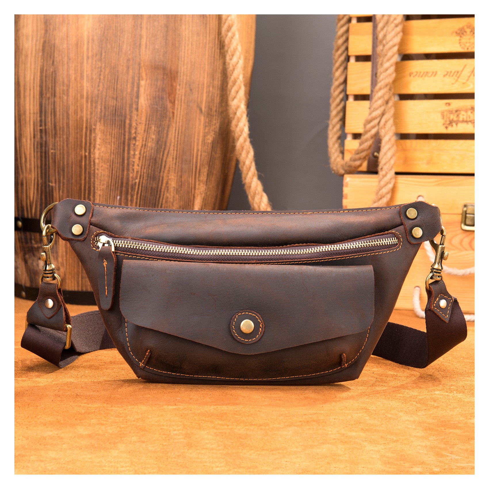Темно-коричневая сумка бананка на поясе изготовлена из высококачественной натуральной кожи. Она имеет большой передний карман, закрывающийся на кнопке-магните, и основной отдел на молнии. Внутри расположен небольшой карман на молнии для мелочей. Все детали выполнены из качественной фурнитуры, что придает сумке стильный и оригинальный вид.
