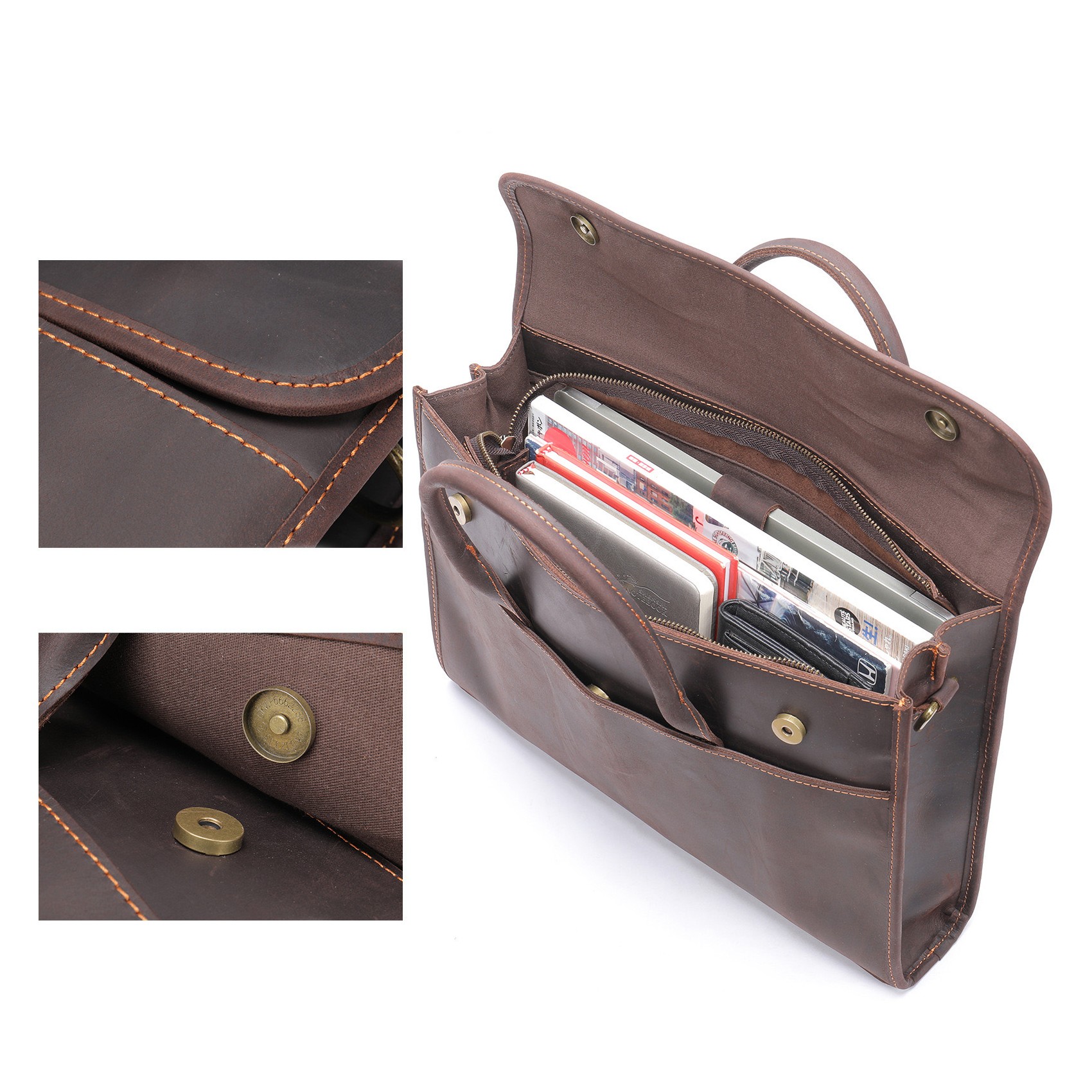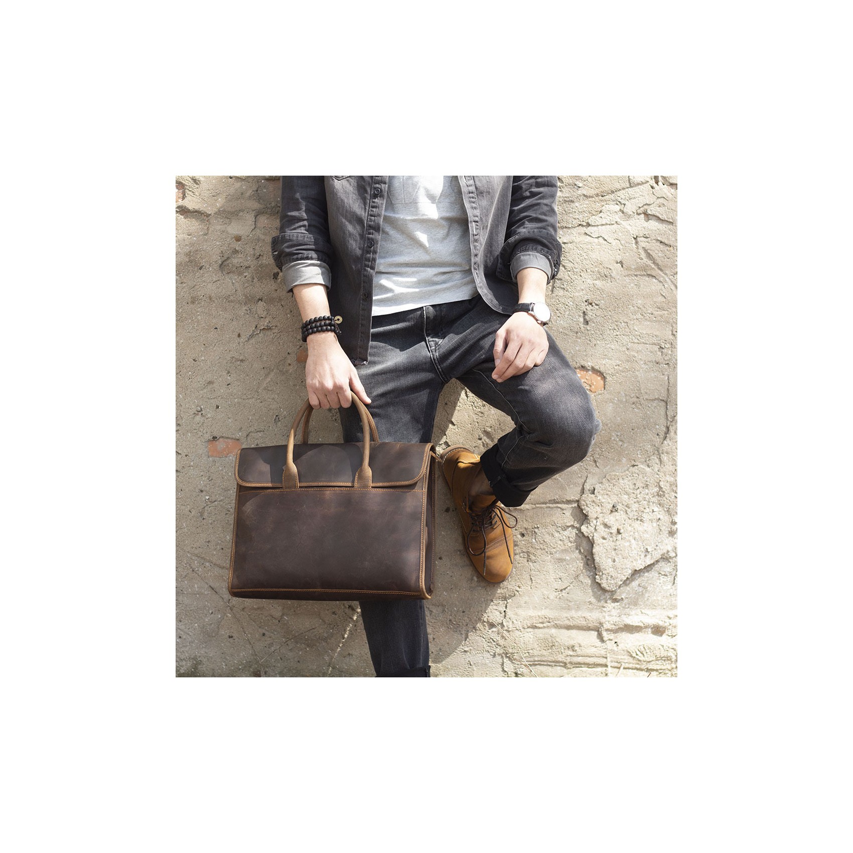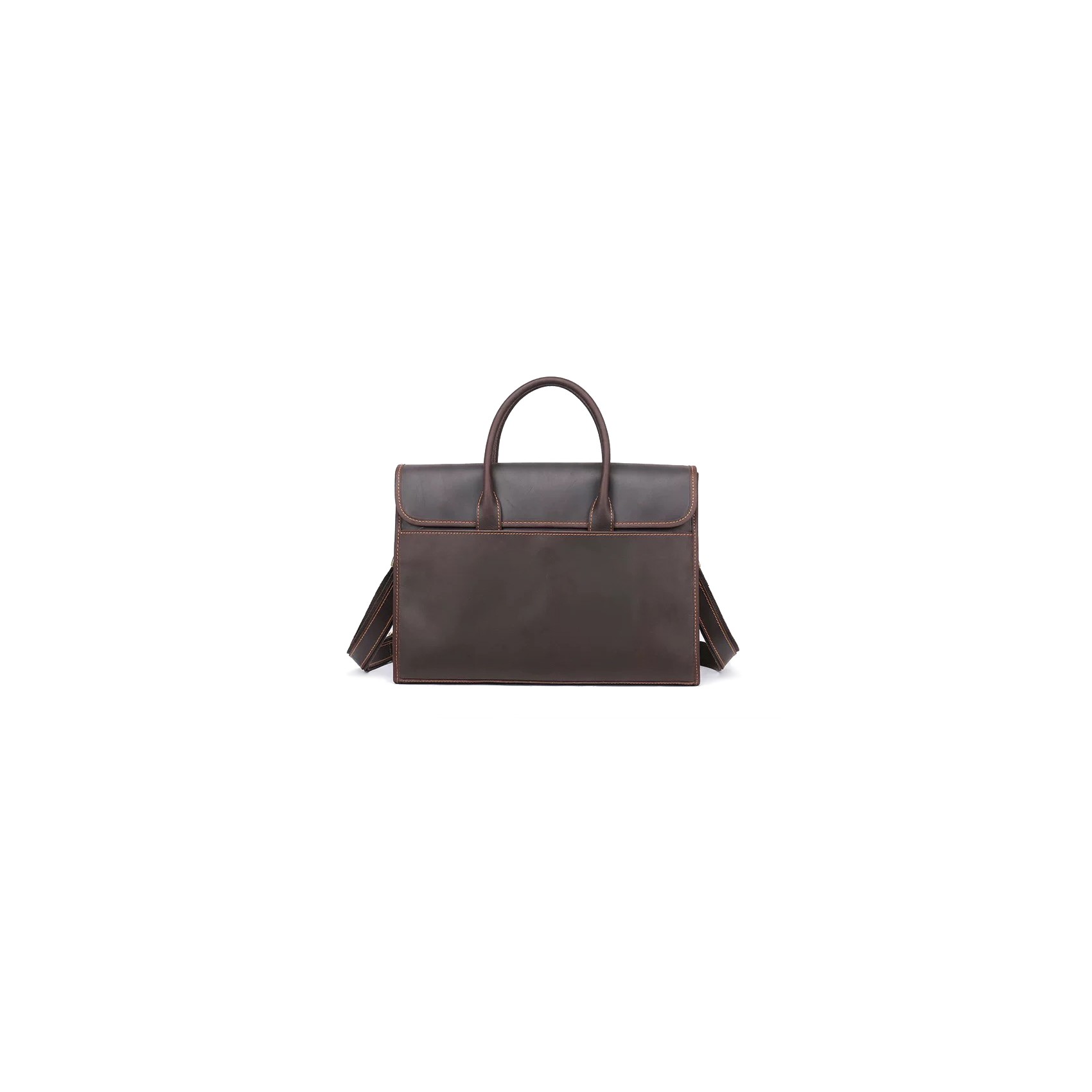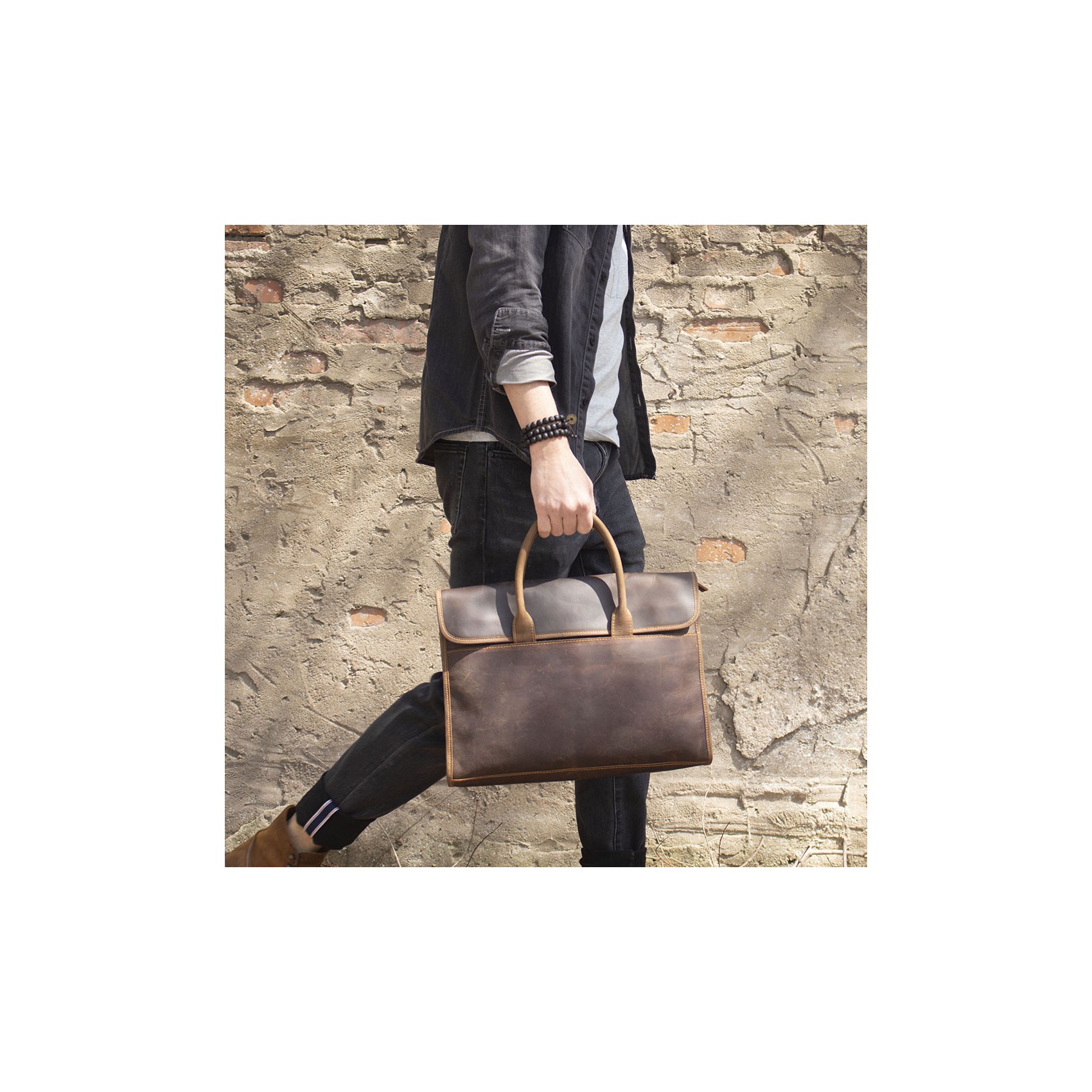 Ця сумка поєднує в собі стиль і функціональність, ідеально підходить для ноутбука 14 дюймів та документів. Відкидний верх на кнопках-магнітах забезпечує легкий доступ до основного відділу, який закривається на блискавку. Внутрішній простір організовано зручно: є відділення для ноутбука, кишеня на блискавці та дві додаткові кишені для дрібниць. Зовнішні великі кишені на кнопках-магнітах додають додаткового місця для зберігання. Знімний плечовий ремінь дозволяє носити сумку з комфортом. Виготовлена з щільної вінтажної шкіри та оснащена надійною металевою фурнітурою YKK з Японії, ця сумка стане вашим надійним супутником у повсякденному житті.