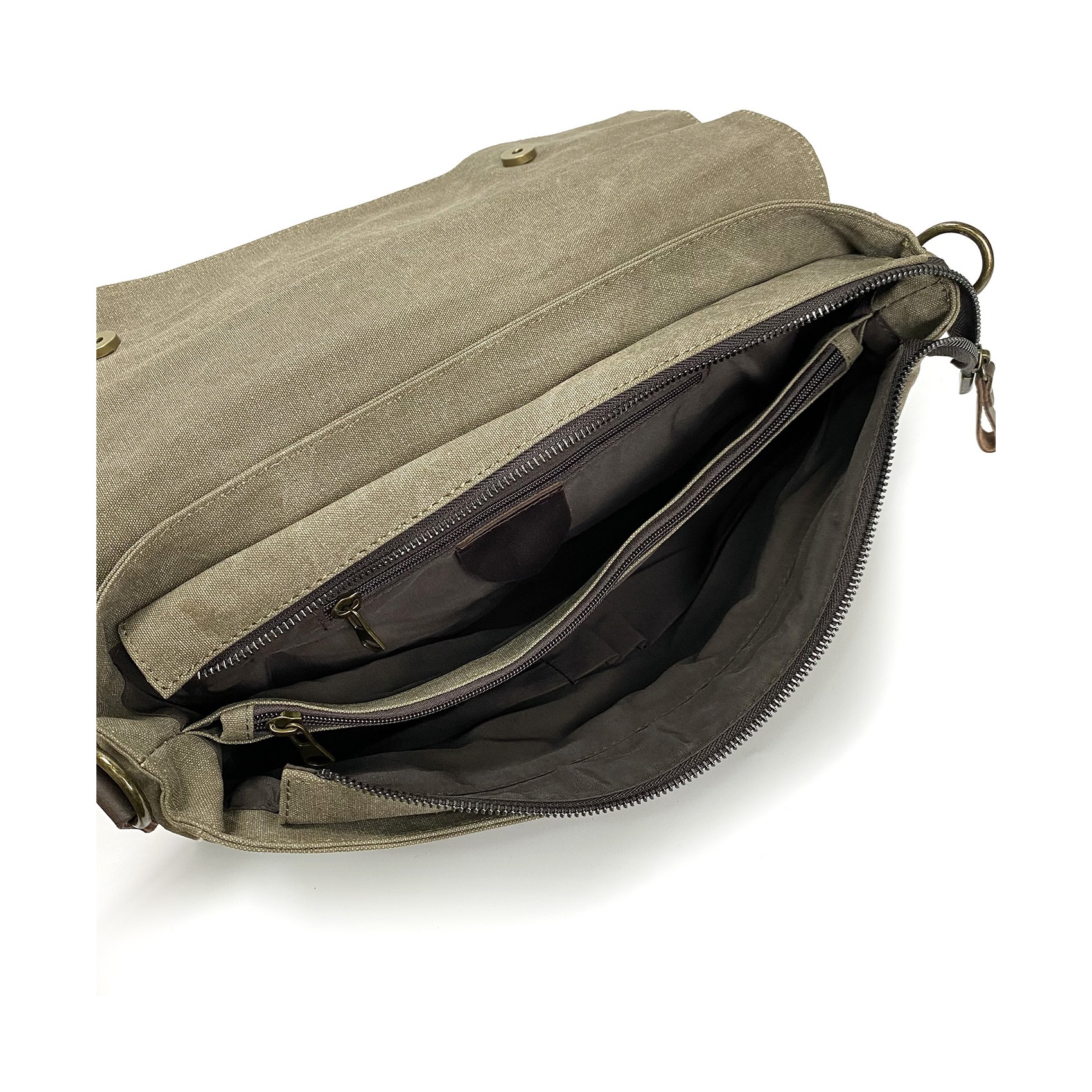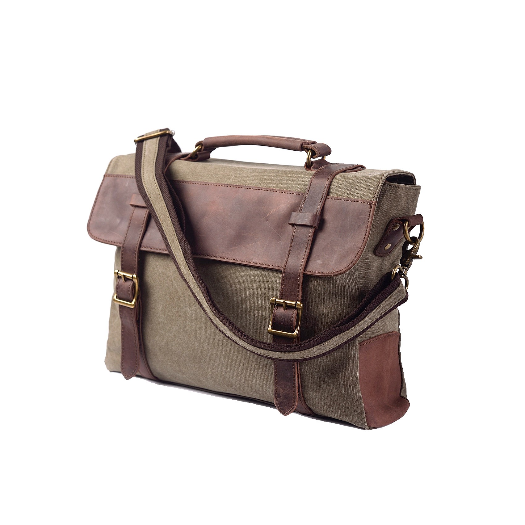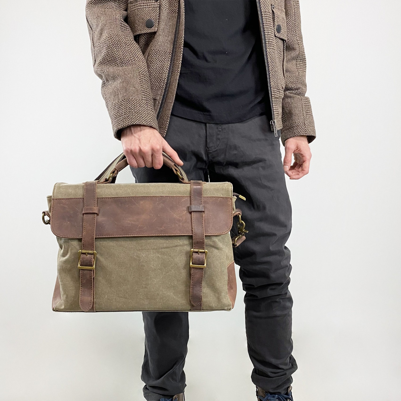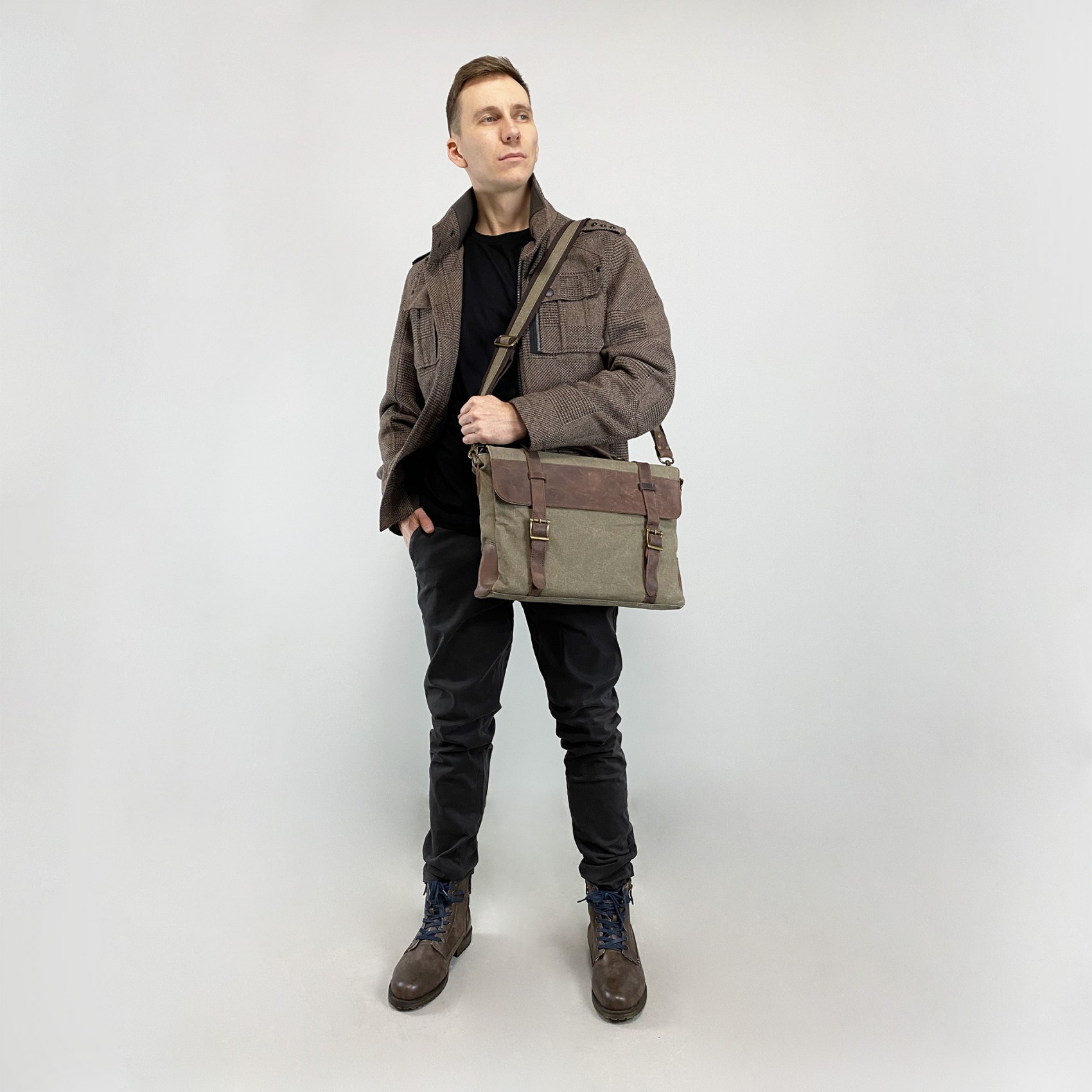 Ця сумка-портфель поєднує в собі стиль і функціональність. Виготовлена з канвасу та натуральної вінтажної шкіри, вона підходить для ноутбука розміром до 14 дюймів. Основне відділення закривається на блискавку та додатково фіксується чотирма кнопками-магнітами. Усередині є перегородка з кишенею на блискавці, а також додаткові кишені для дрібниць і відділення для ручок. На зворотному боці розташована велика кишеня на блискавці. У комплекті йде довга ручка через плече, яку можна відстібнути за потреби.