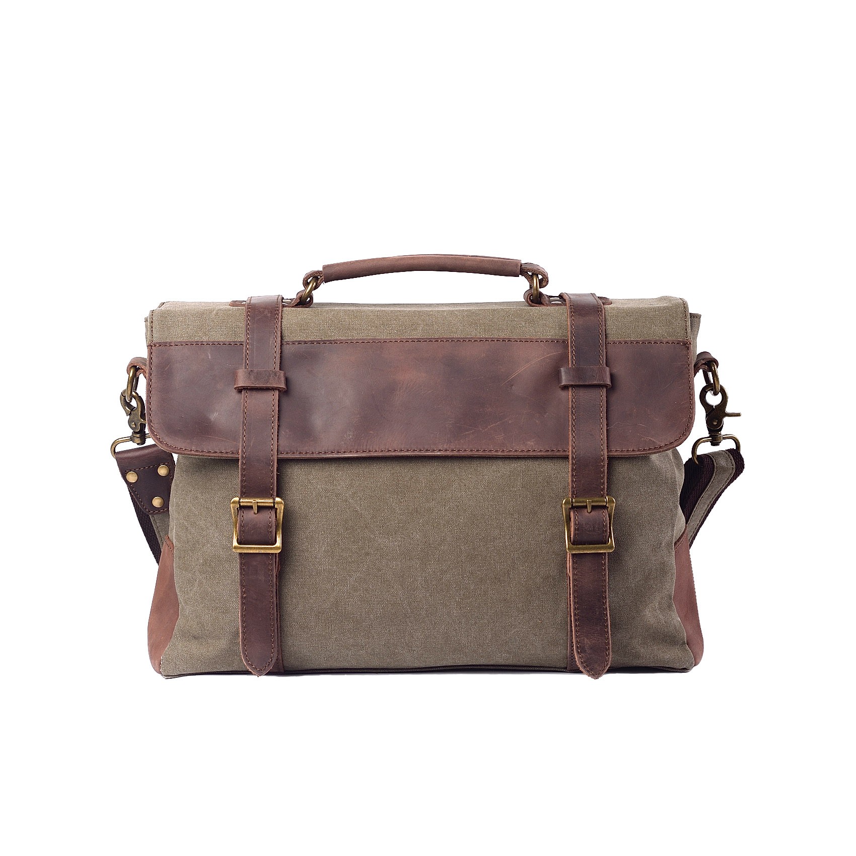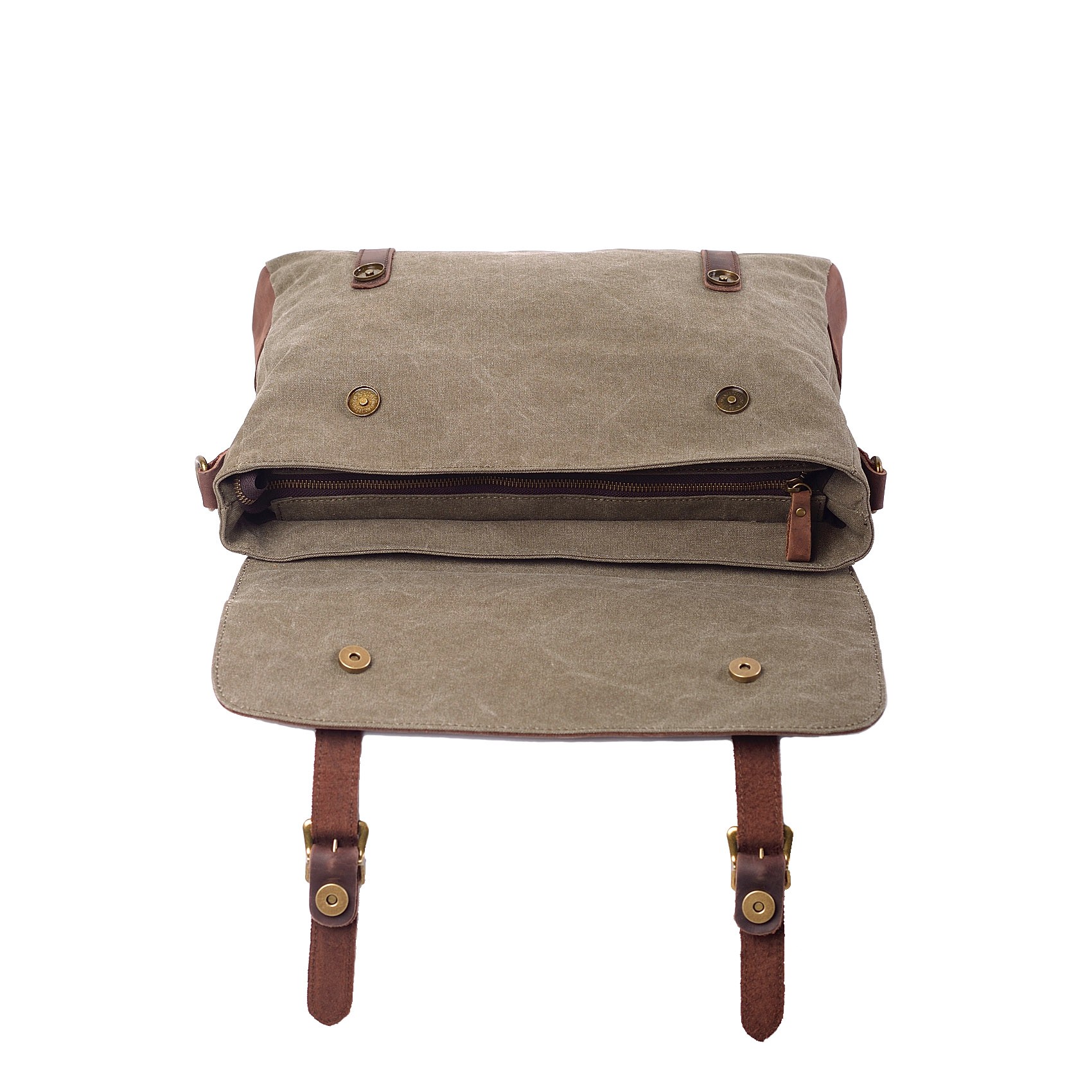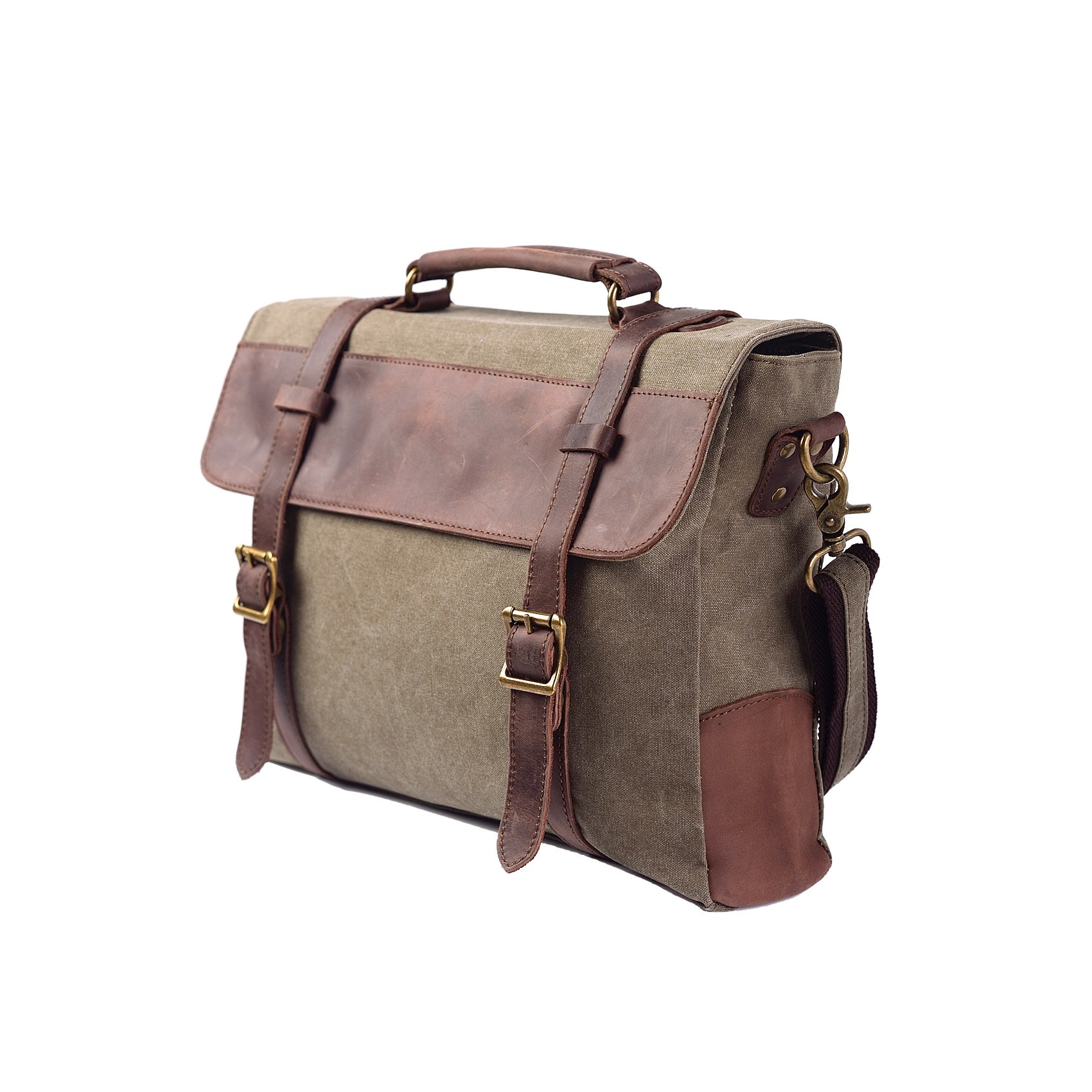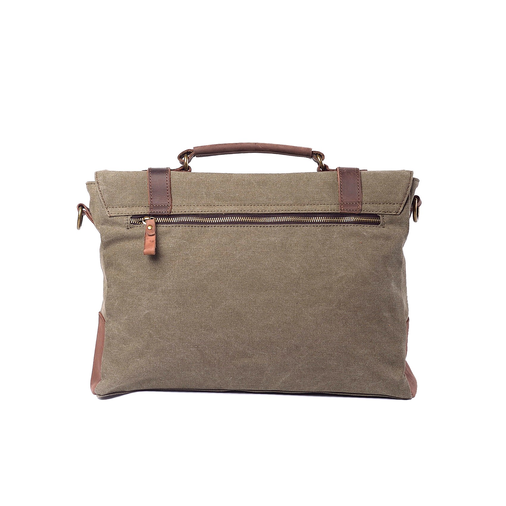 Ця сумка-портфель поєднує в собі стиль і функціональність. Виготовлена з канвасу та натуральної вінтажної шкіри, вона підходить для ноутбука розміром до 14 дюймів. Основне відділення закривається на блискавку та додатково фіксується чотирма кнопками-магнітами. Усередині є перегородка з кишенею на блискавці, а також додаткові кишені для дрібниць і відділення для ручок. На зворотному боці розташована велика кишеня на блискавці. У комплекті йде довга ручка через плече, яку можна відстібнути за потреби.
