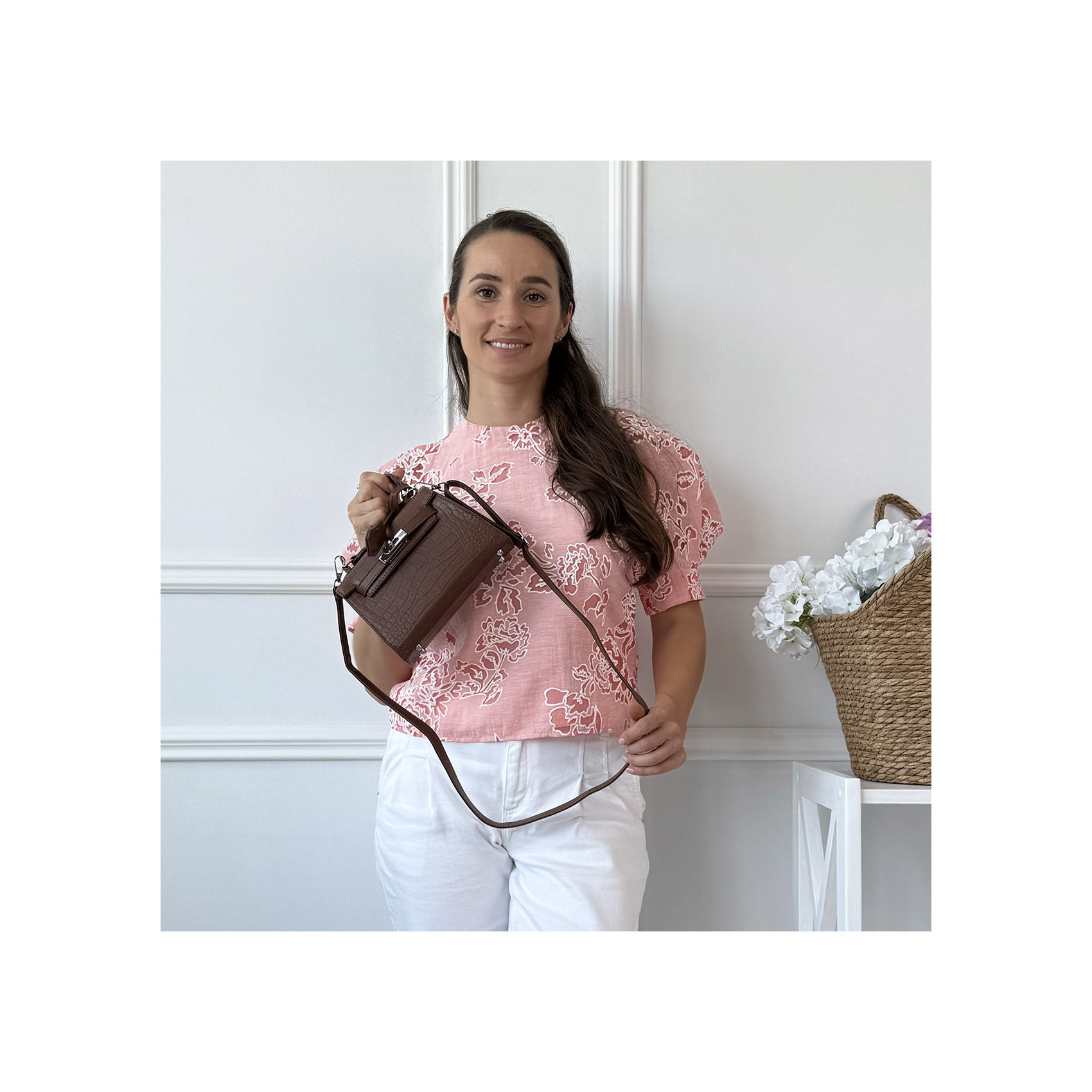Сумка Cristal у коричневому кольорі — це втілення елегантності та мінімалізму. Її центральний замок не лише забезпечує надійність, але й додає аксесуару стильного акценту. Внутрішнє відділення ідеально підходить для зберігання найнеобхідніших речей, а знімний регульований ремінець дозволить вам носити сумку так, як вам зручно — через плече або в руках, використовуючи витончену верхню ручку. Коричневий колір додає універсальності, роблячи сумку Cristal ідеальним вибором як для повсякденного образу, так і для вечірнього виходу.