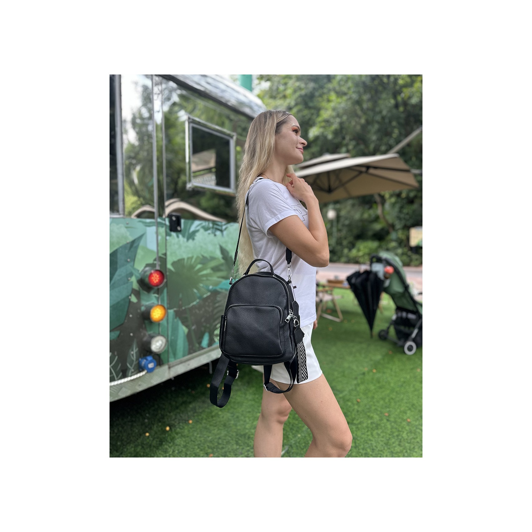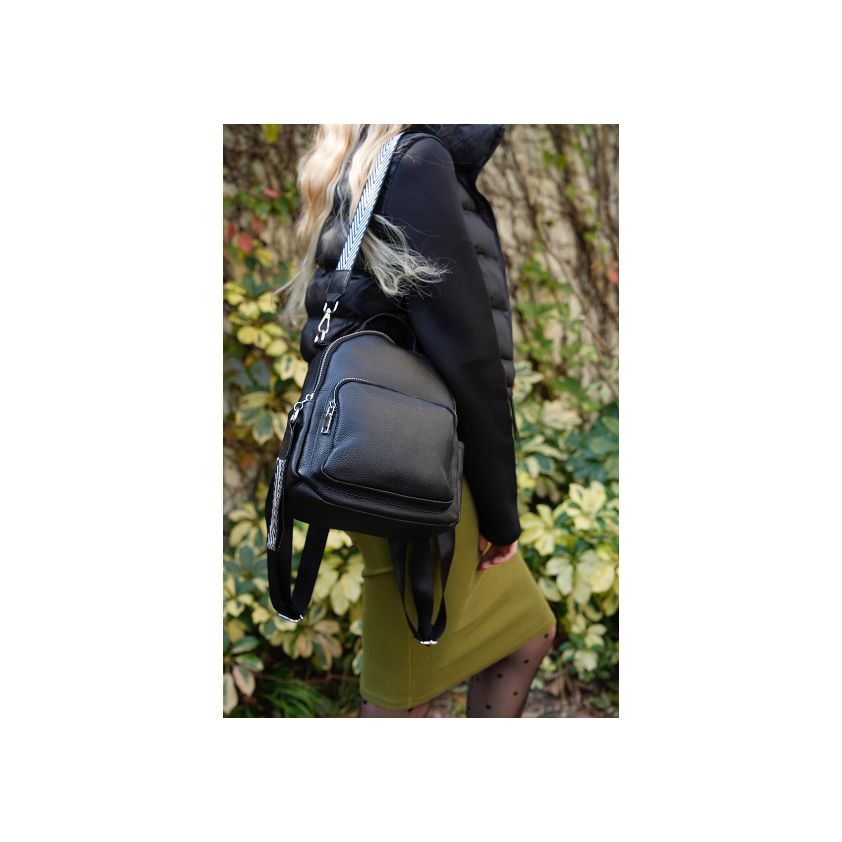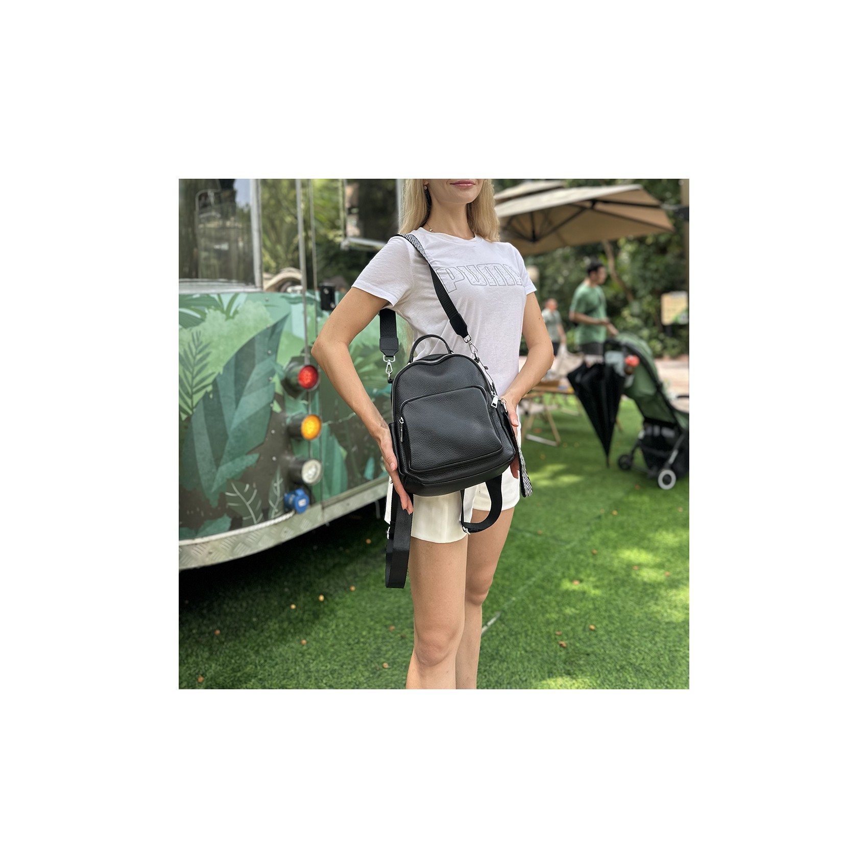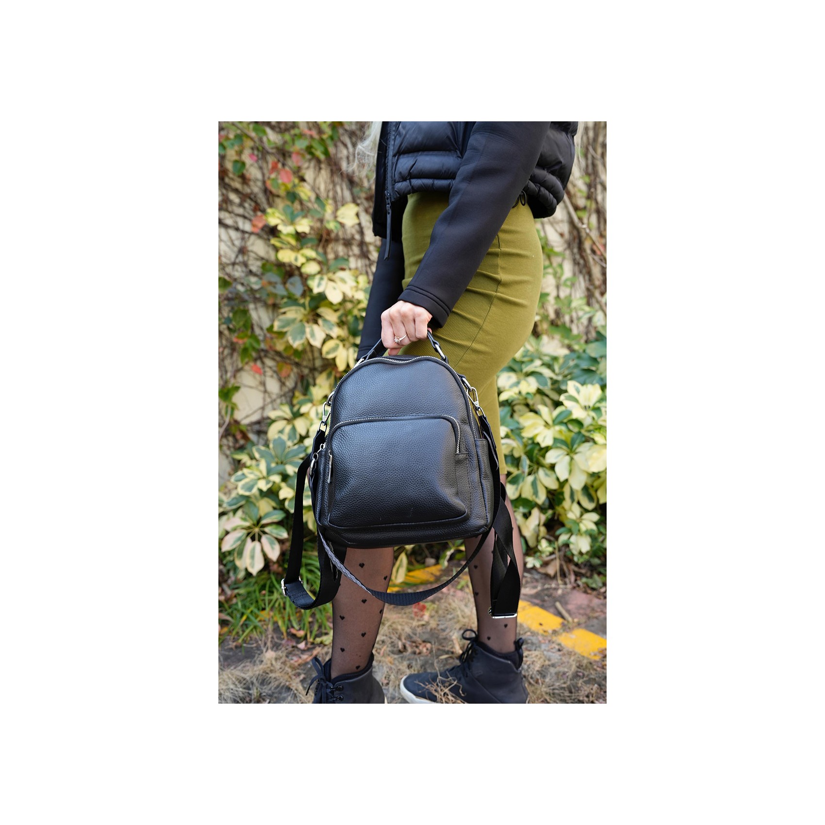 Рюкзак Adeline виготовлений із натуральної шкіри глибокого чорного кольору, яка поєднує в собі м’якість і міцність. Його дизайн продуманий до дрібниць: спереду розташована містка кишеня на блискавці — зручно для речей, до яких потрібен швидкий доступ. Основне відділення закривається на блискавку з двома бігунками, що забезпечує зручне відкривання з будь-якого боку.