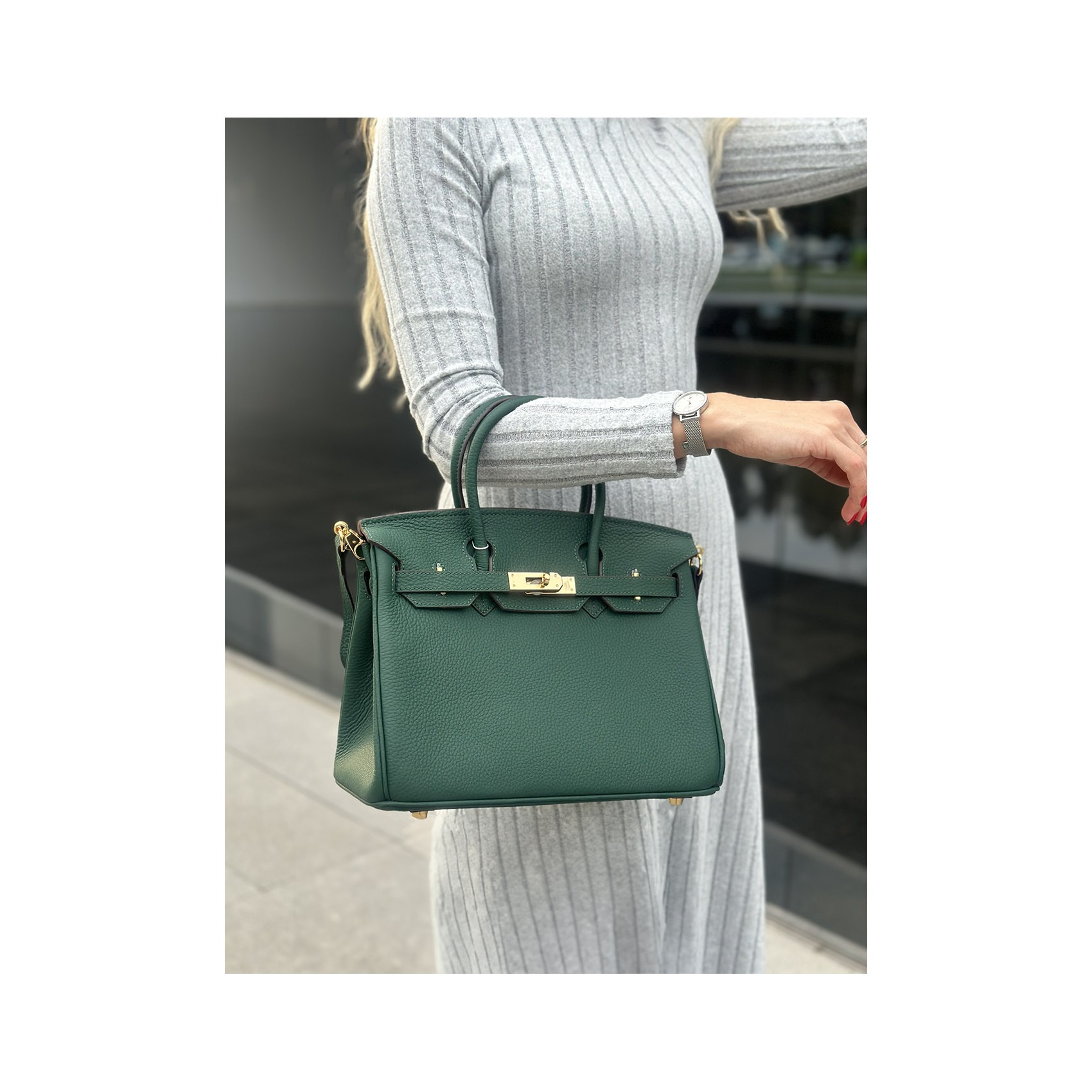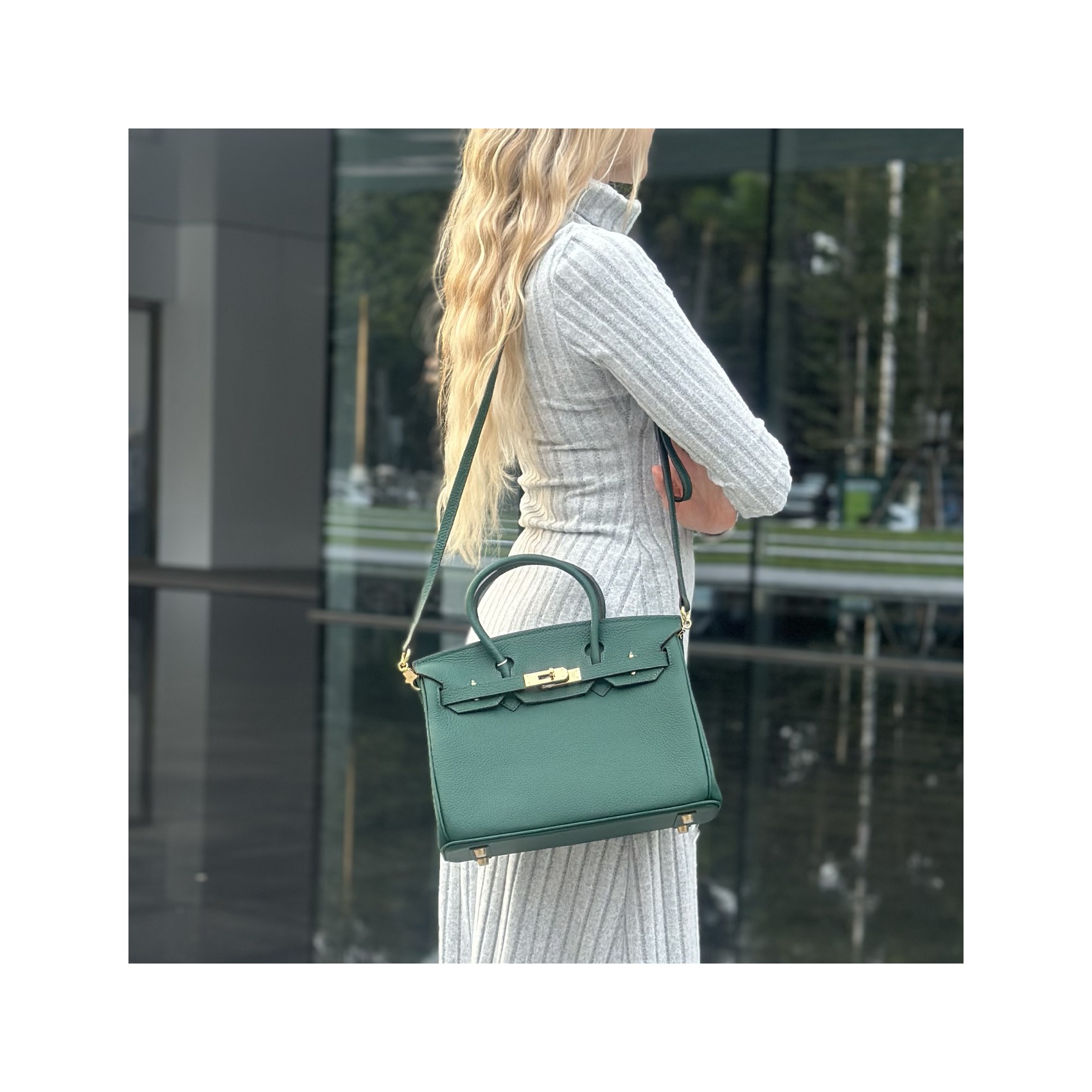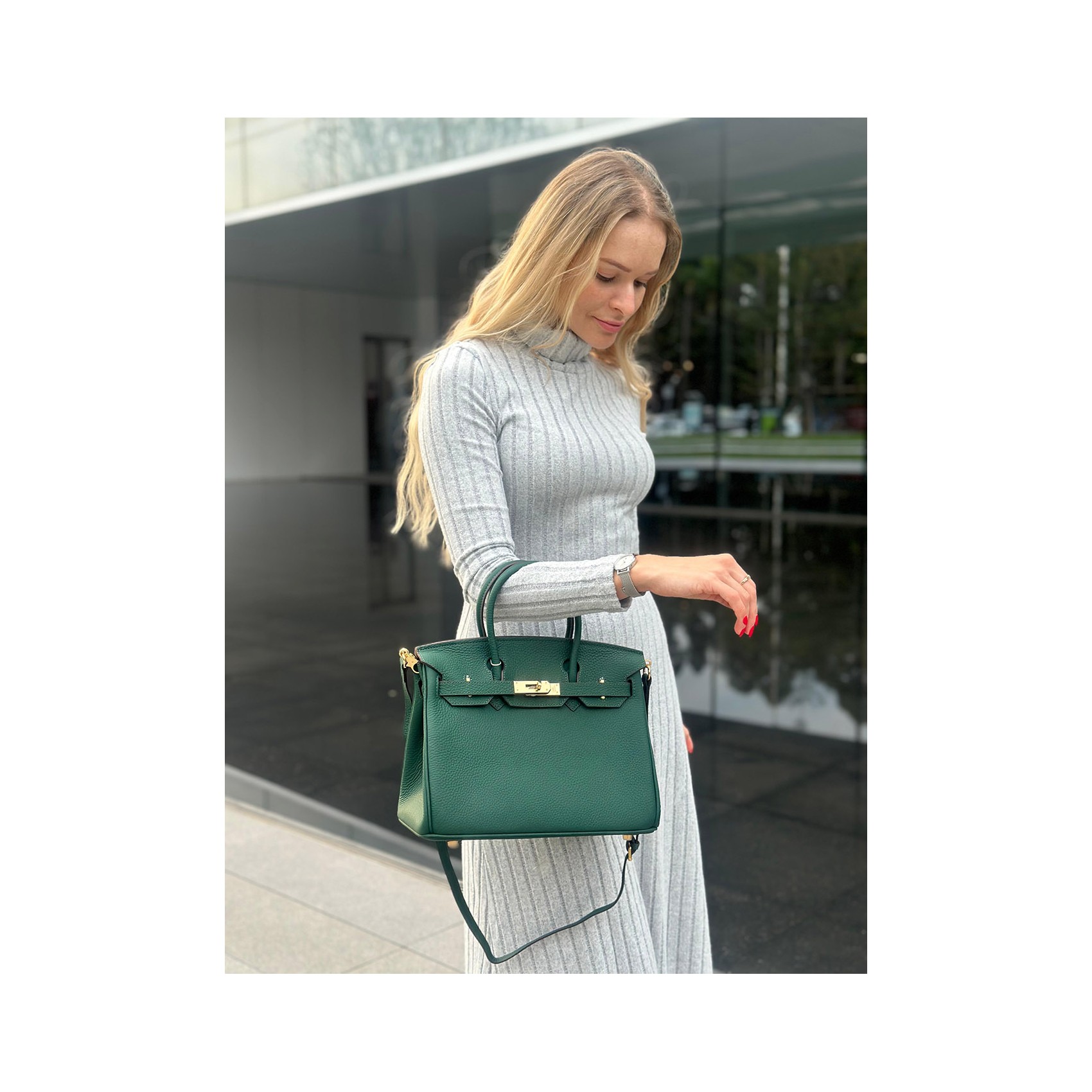 Елегантна жіноча шкіряна сумка Brigitte у розкішному темно-зеленому кольорі — це поєднання стилю та практичності, яке підкреслює ваш бездоганний смак. Виготовлена з високоякісної натуральної шкіри, сумка відрізняється своєю міцністю та елегантним зовнішнім виглядом. Зручне закриття на замочок забезпечує безпеку ваших речей, а продуманий внутрішній дизайн включає кишеню на блискавці та окрему кишеню для дрібниць, щоб усе необхідне завжди було під рукою.