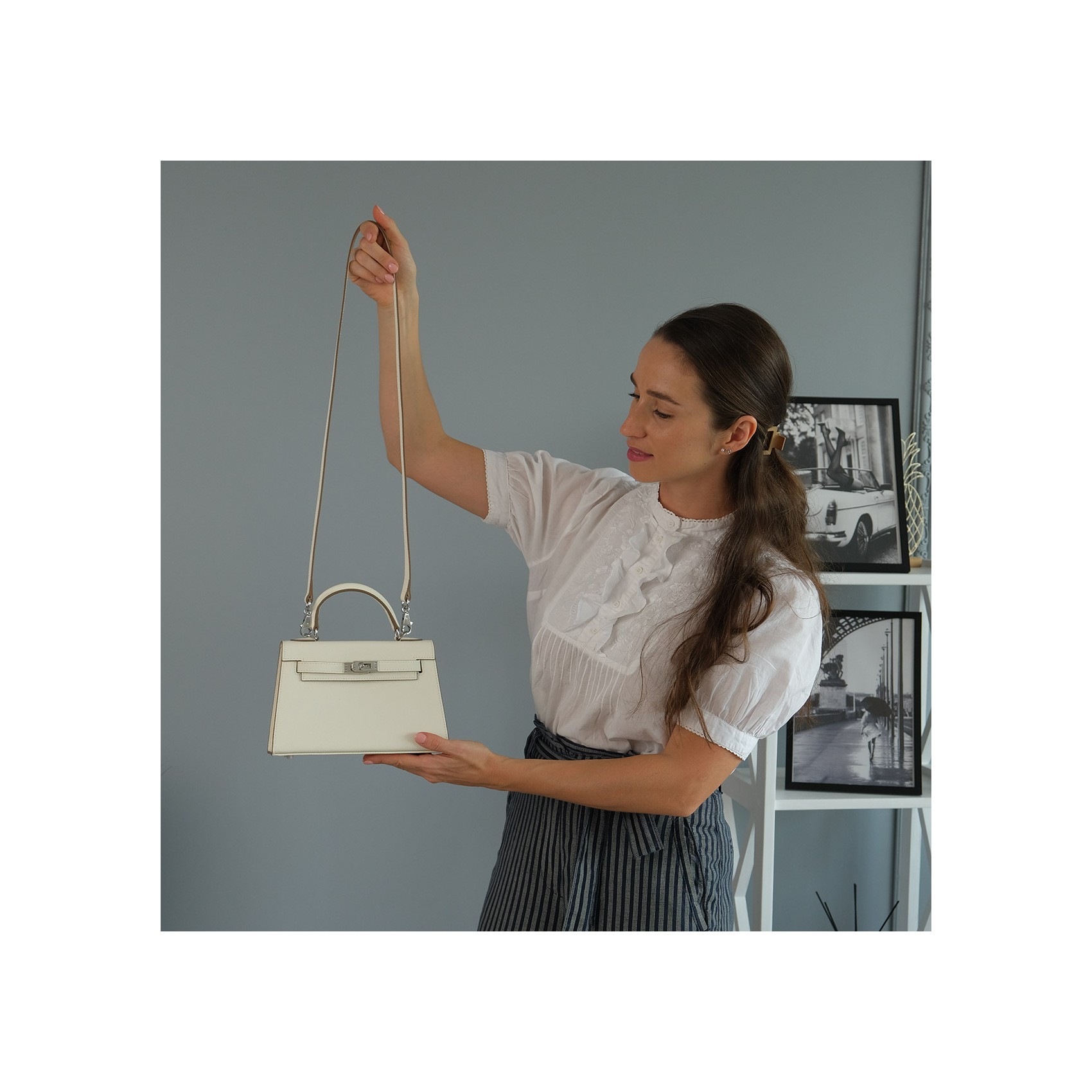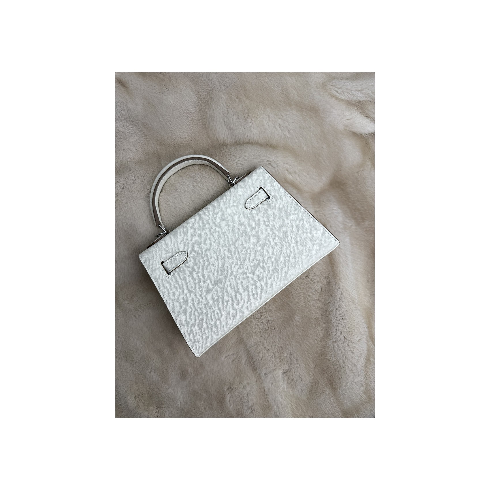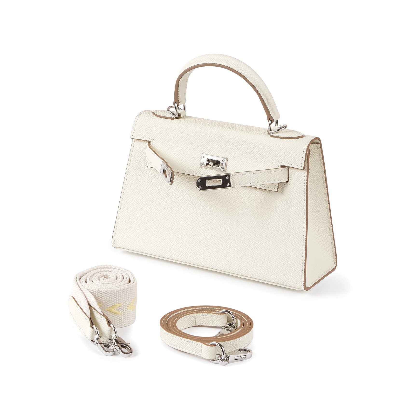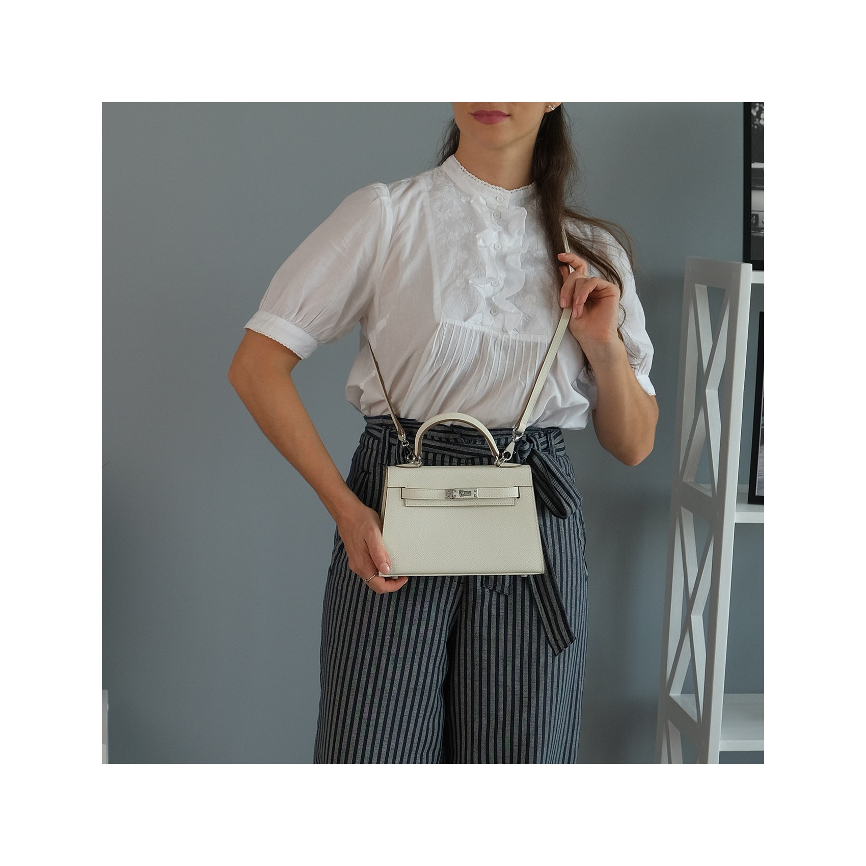 Жіноча сумка Kelly білого кольору виготовлена з натуральної шкіри з матовою текстурою та охайною обробкою. Модель доповнена сріблястою фурнітурою та замком-застібкою, що забезпечує надійне закривання. Усередині розміщено дві зручні кишені для зберігання дрібних речей - ключів, карток, навушників. У комплект входять два знімні плечові ремінці - широкий та вузький, що дозволяє змінювати стиль носіння залежно від образу чи ситуації. Білий відтінок додає аксесуару яскравості та індивідуальності, роблячи його доречним як для повсякденних прогулянок, так і для офісу чи вечірнього виходу.