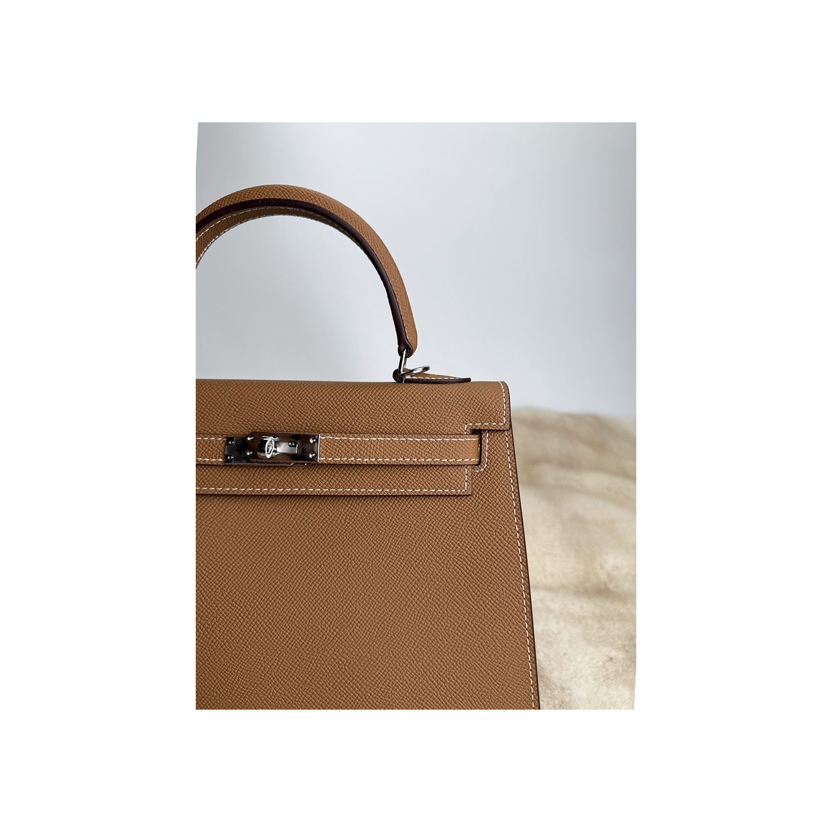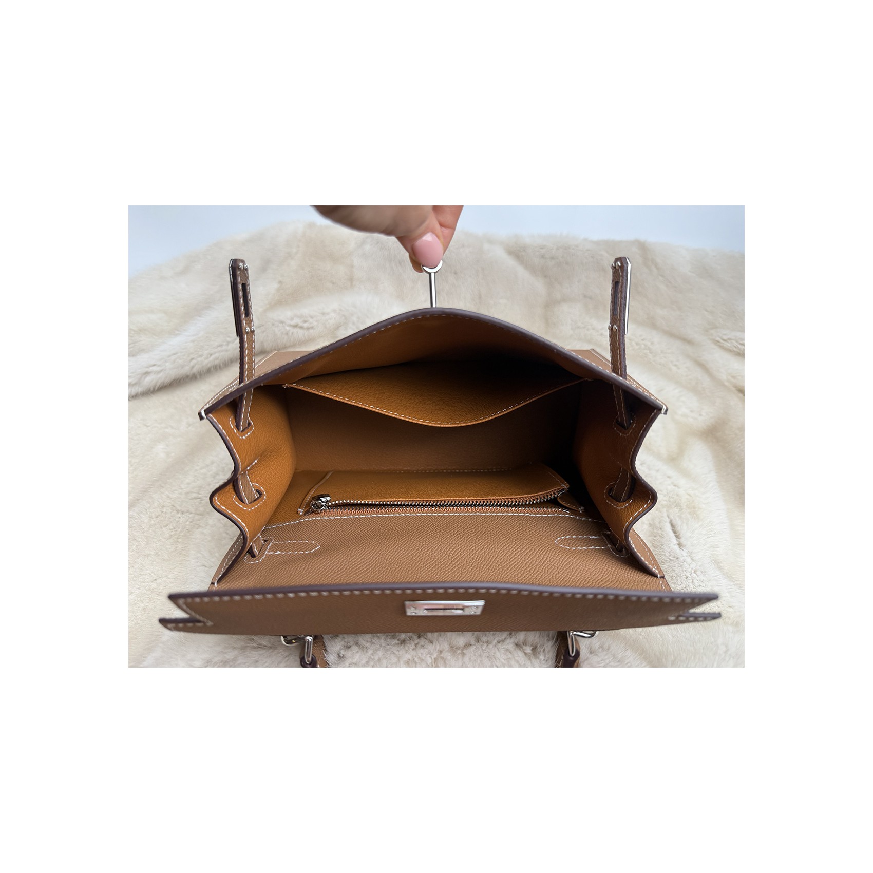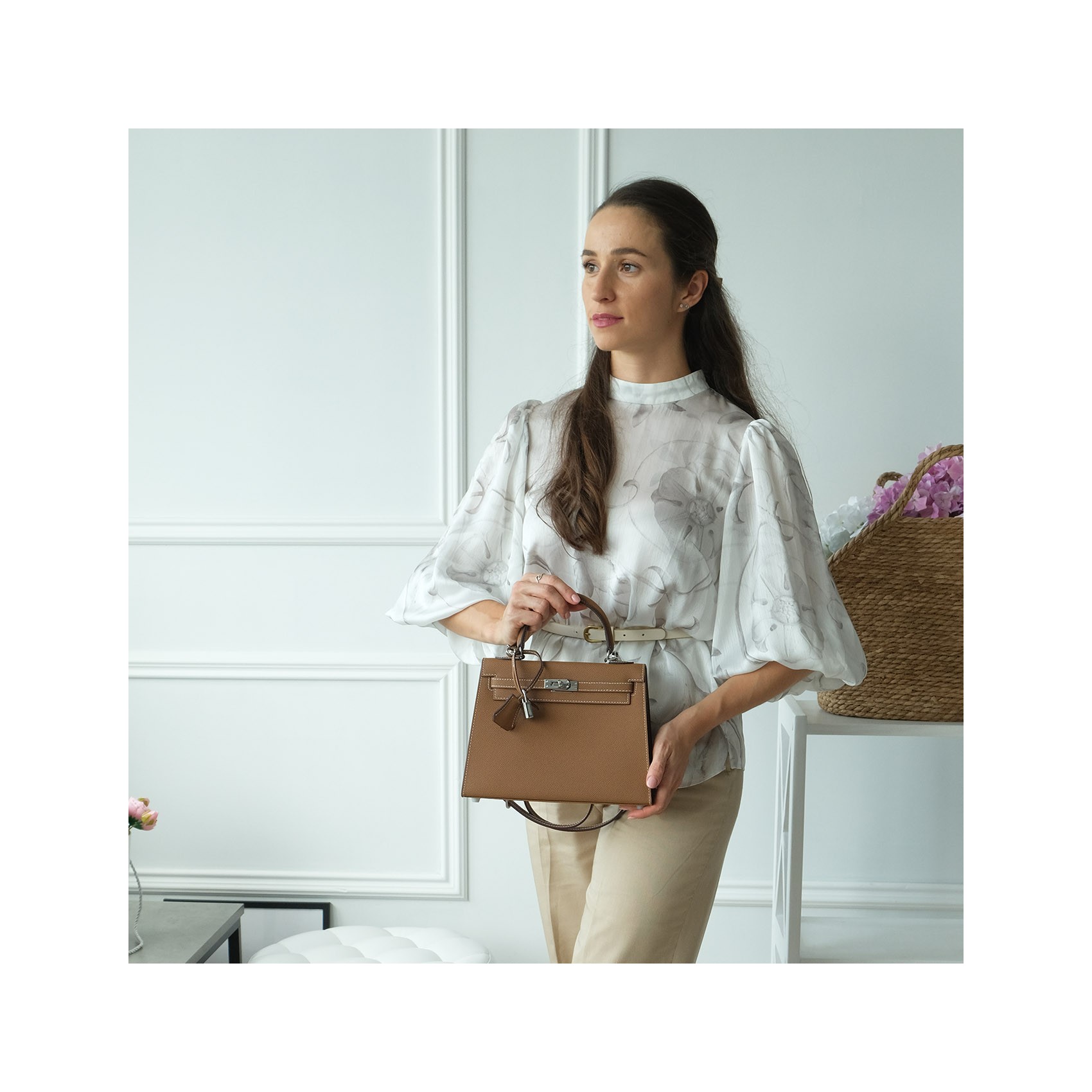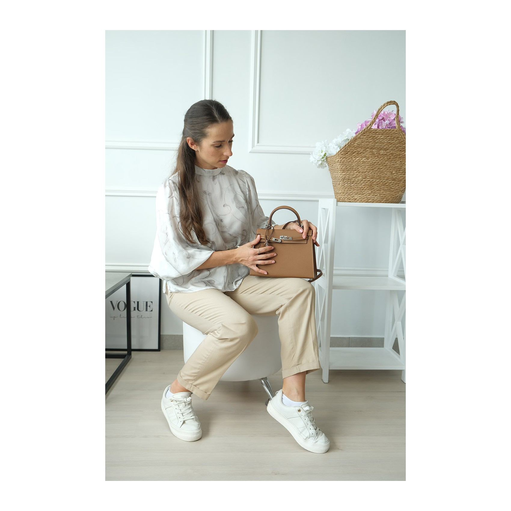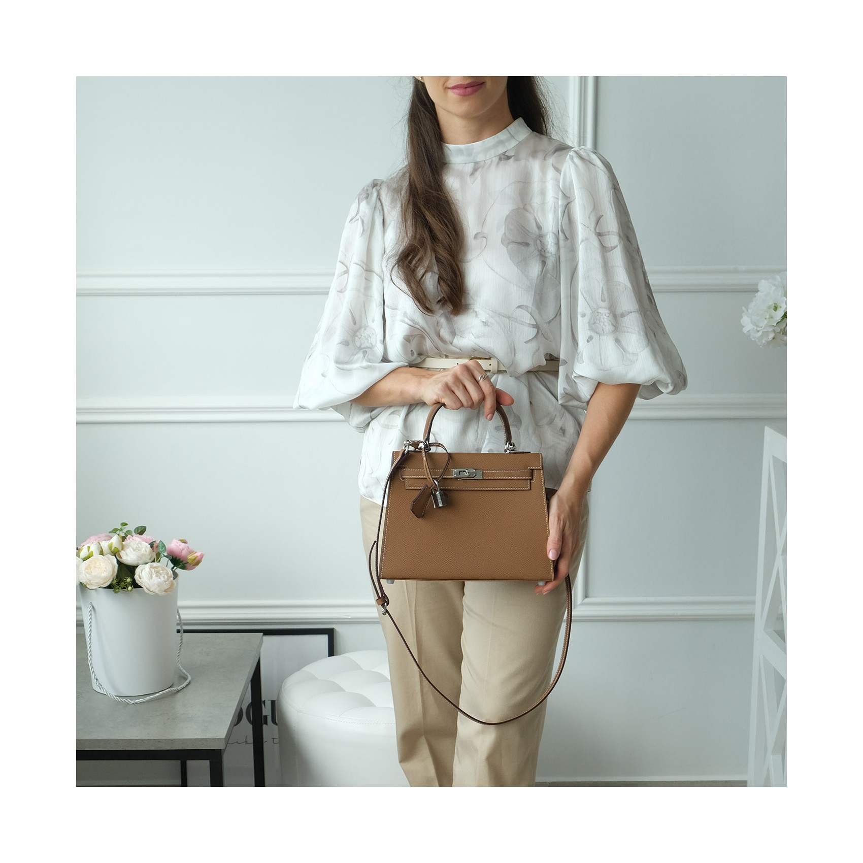 Жіноча сумка Kelly коричневого кольору виготовлена з натуральної шкіри з гладкою текстурою та відзначається якісним оздобленням. Елегантна модель доповнена срібною фурнітурою, включаючи декоративний замок, який надійно фіксує клапан. Компактні розміри дозволяють зручно розмістити повсякденні речі, а внутрішні кишені забезпечують комфортну організацію зберігання, зокрема потаємну кишеню на блискавці для документів і дрібниць. Сумка оснащена знімним ремінцем, що робить її універсальною: її можна носити в руці або на плечі. Цей аксесуар гармонійно доповнить як діловий, так і повсякденний образ, підкреслюючи смак і стиль власниці.