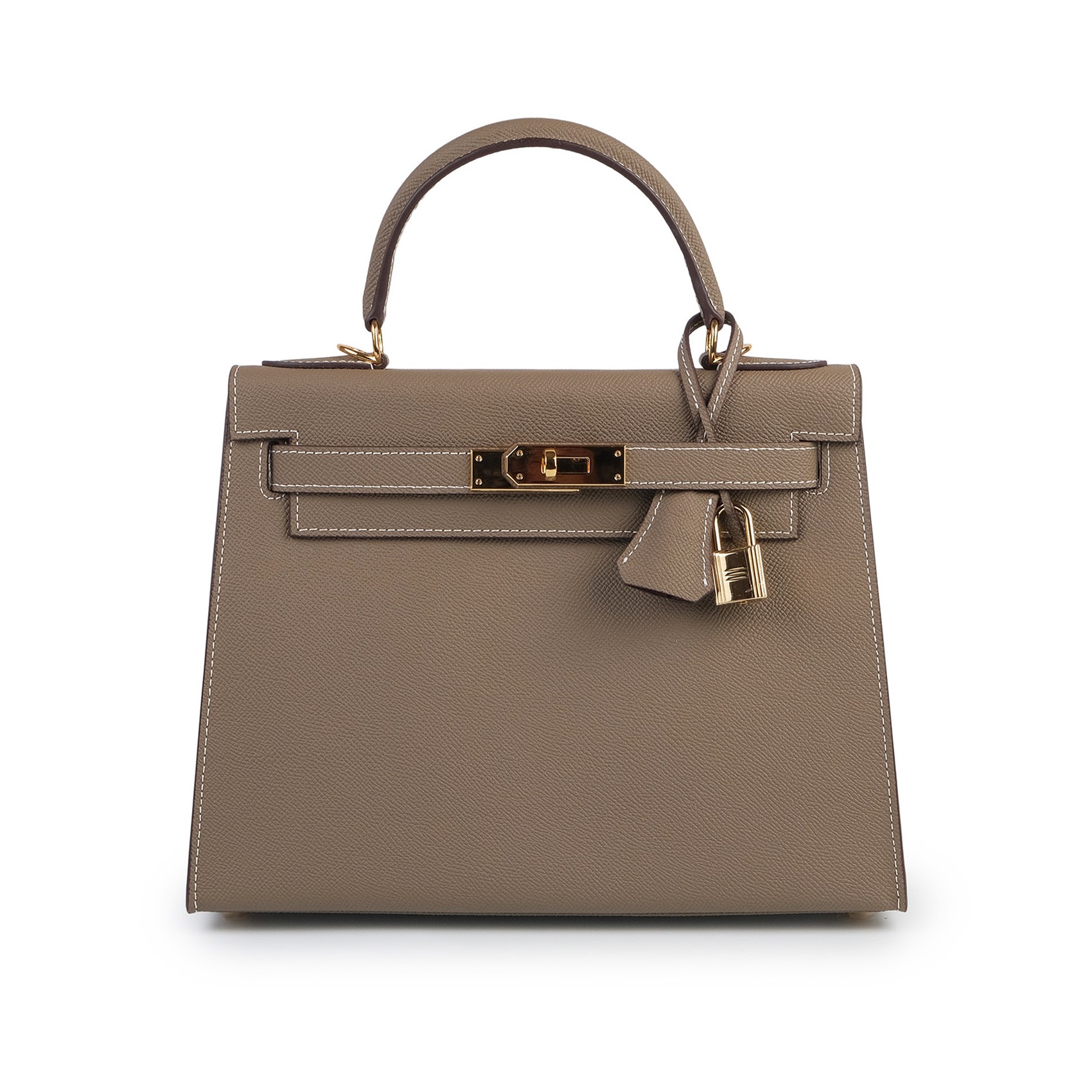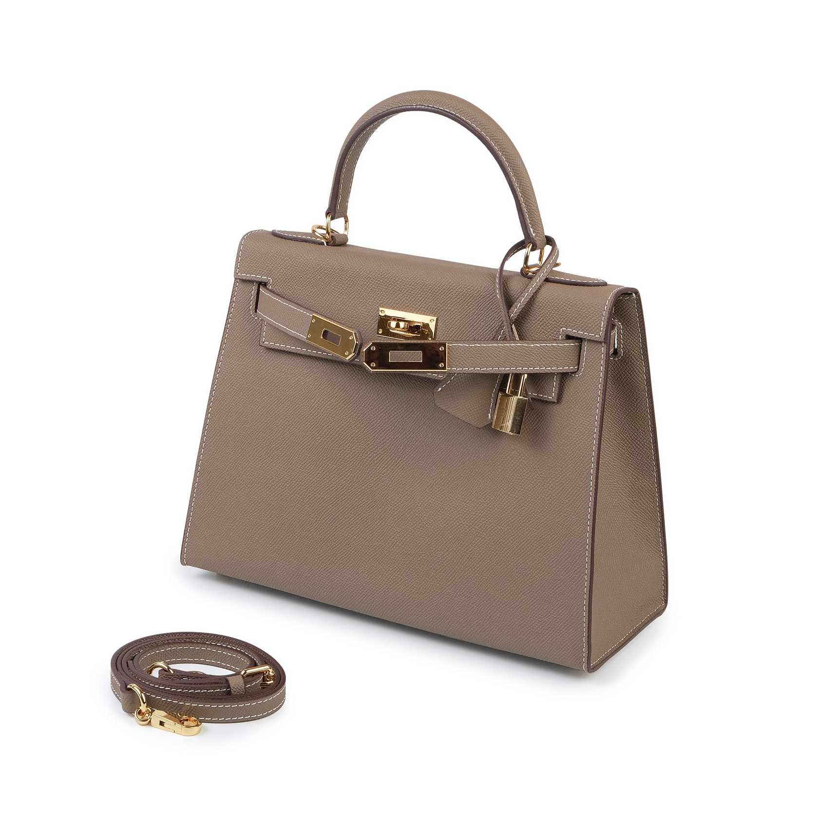 Жіноча сумка Kelly сіро-бежевого кольору виготовлена з натуральної шкіри з гладкою текстурою та відзначається якісним оздобленням. Елегантна модель доповнена золотистою фурнітурою, включаючи декоративний замок, який надійно фіксує клапан. Компактні розміри дозволяють зручно розмістити повсякденні речі, а внутрішні кишені забезпечують комфортну організацію зберігання, зокрема потаємну кишеню на блискавці для документів і дрібниць. Сумка оснащена знімним ремінцем, що робить її універсальною: її можна носити в руці або на плечі. Цей аксесуар гармонійно доповнить як діловий, так і повсякденний образ, підкреслюючи смак і стиль власниці.