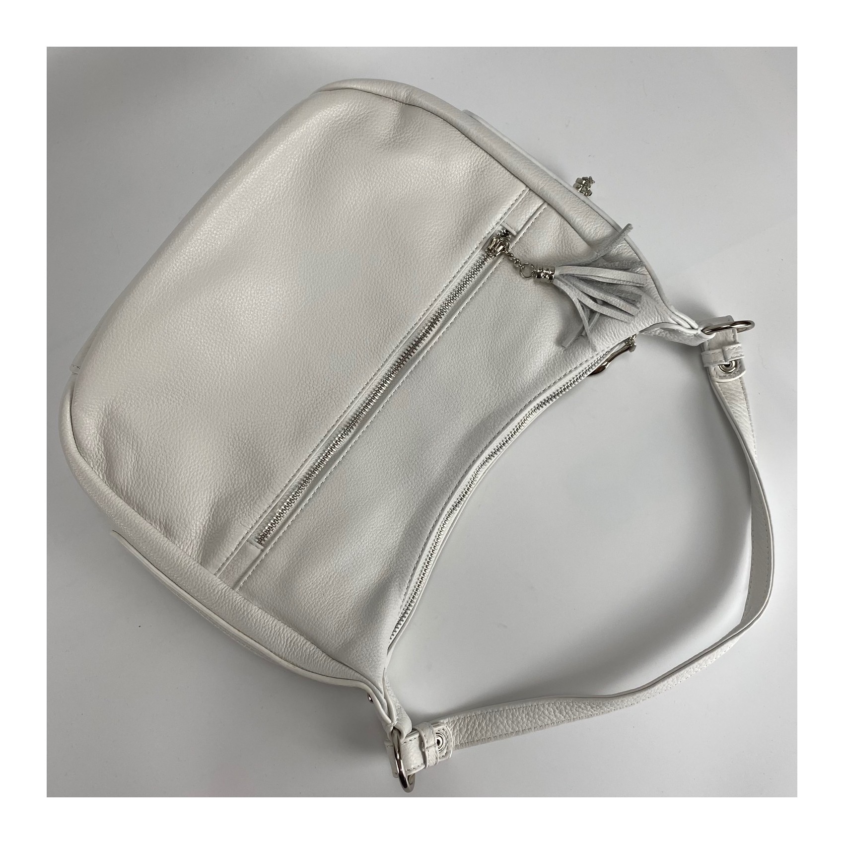 Жіноча шкіряна сумка-хобо Linda у білому кольорі подарує вашому образу невимушену розкіш та стиль.
