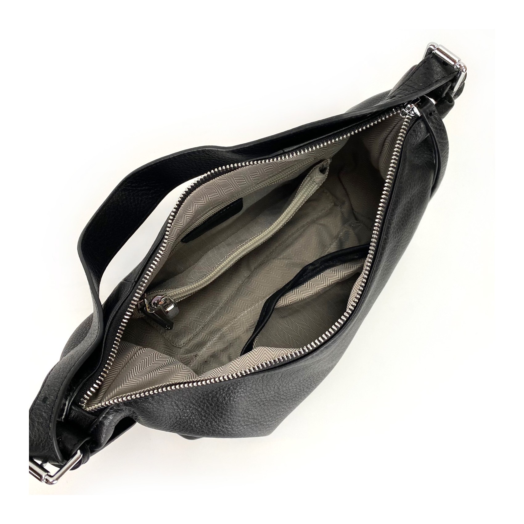 Жіноча шкіряна сумка хобо Monica у чорному кольорі - це досконале поєднання вишуканості та комфорту. Її натуральна шкіра ніжно обіймає ваші руки, приносячи радість та задоволення при кожному торканні.