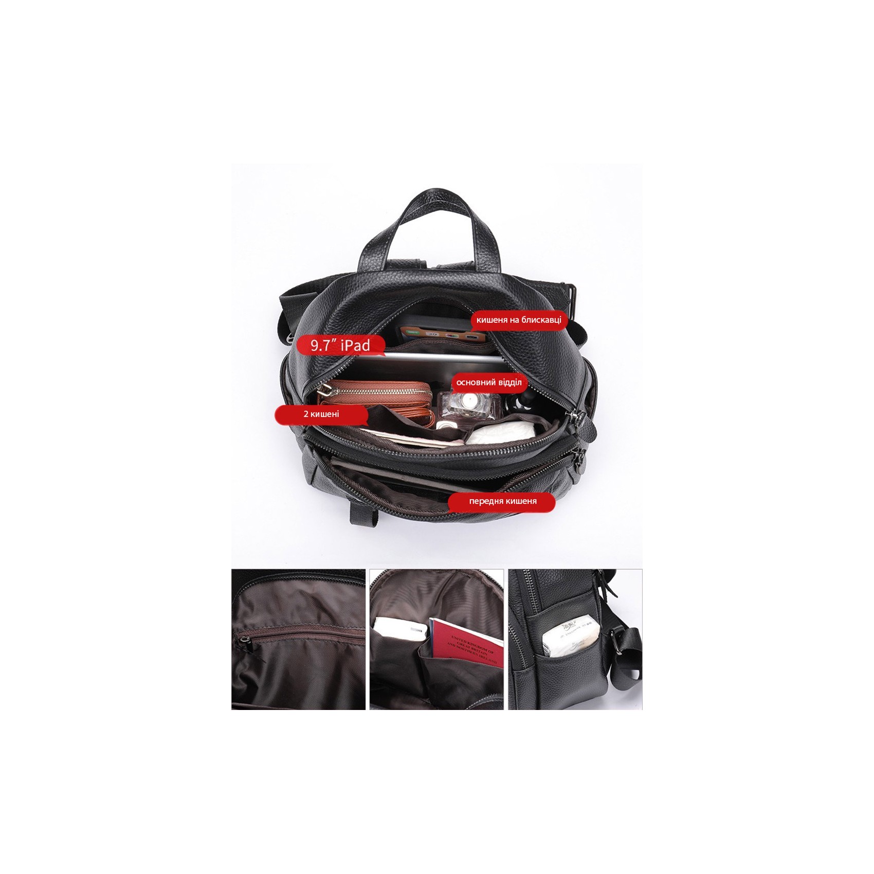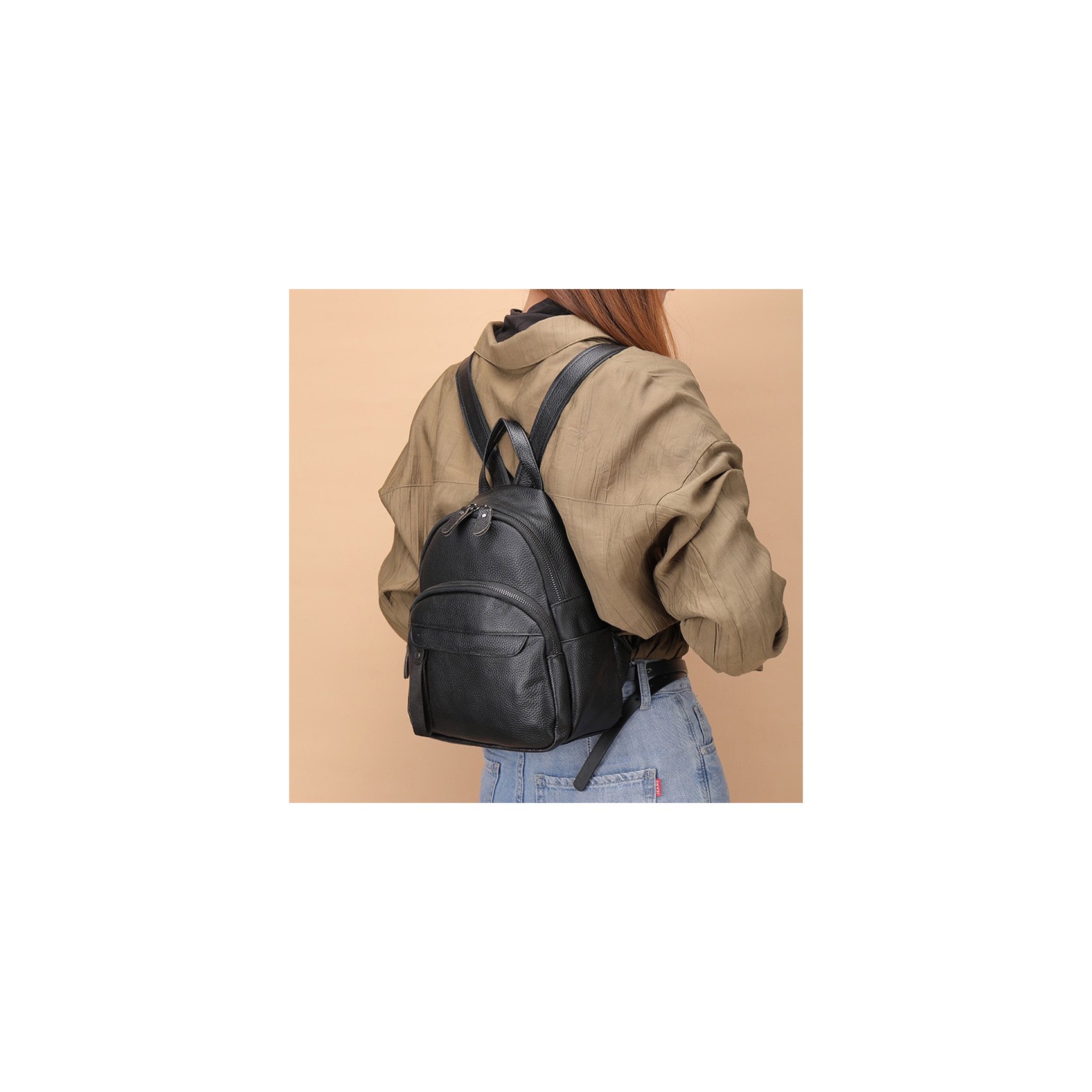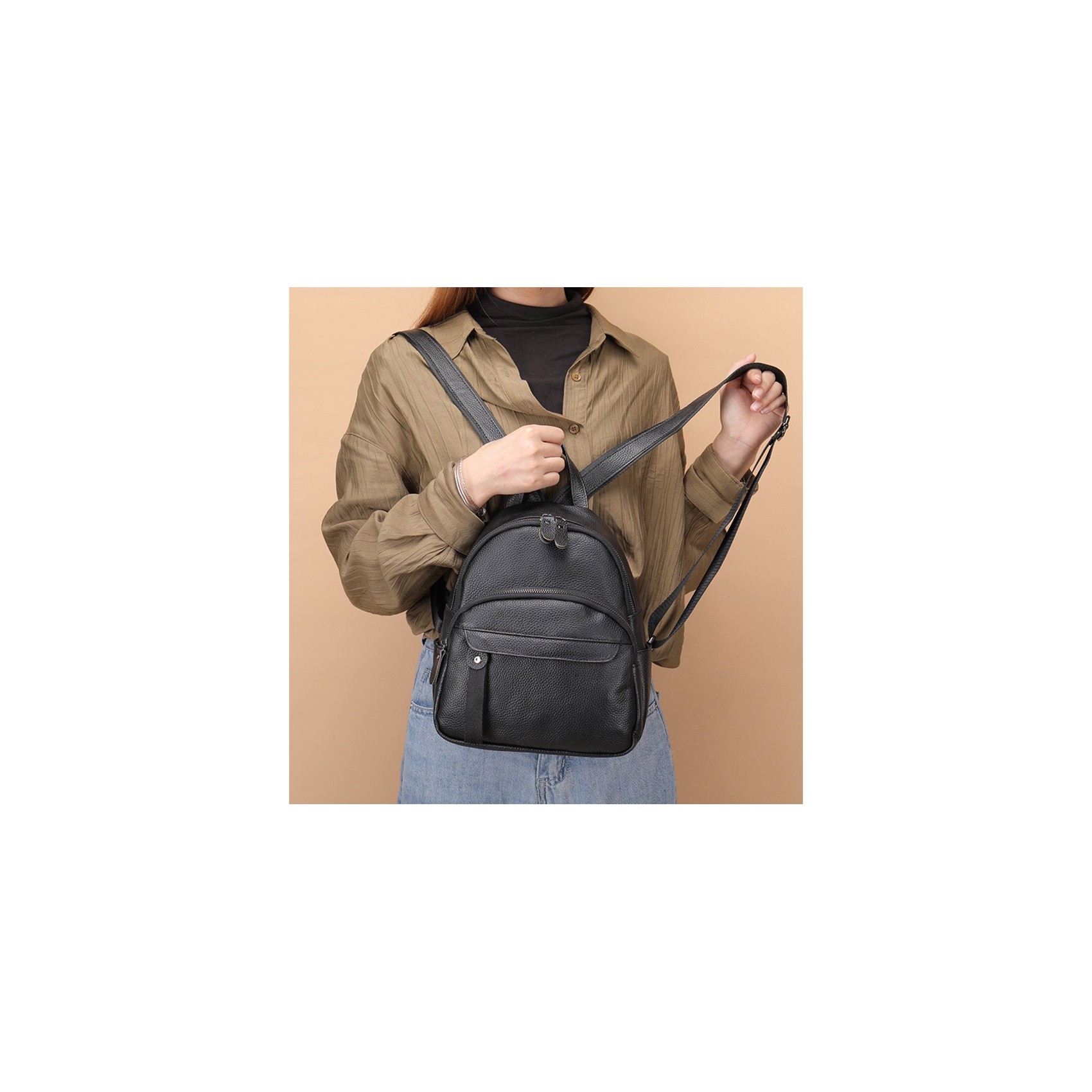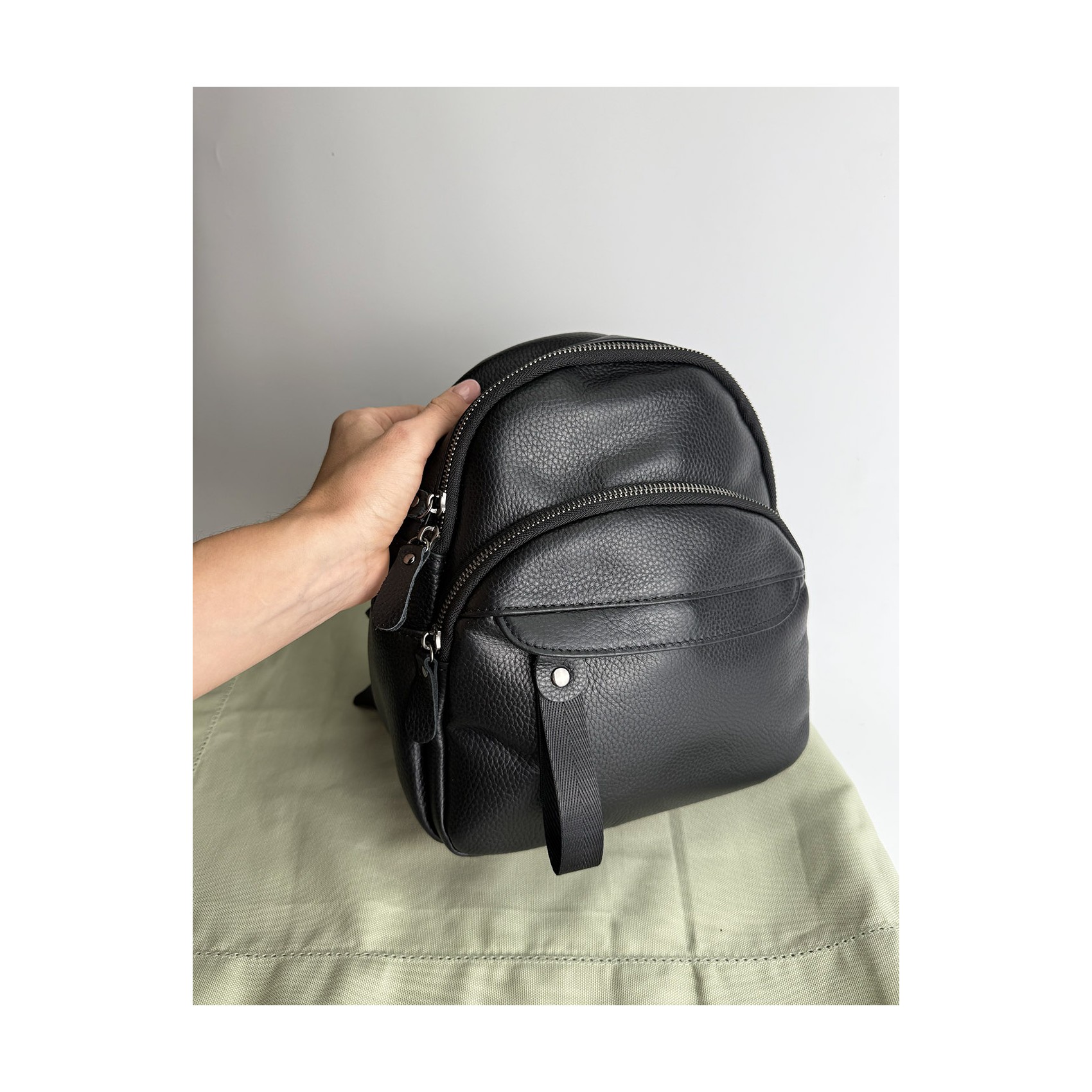 Этот женский рюкзак изготовлен из кожи, что придает ему элегантный вид и долговечность. Спереди расположены два удобных кармана на молнии, которые позволяют быстро достать необходимые вещи. Основное отделение закрывается на молнию с двумя бегунками, что обеспечивает легкий доступ к содержимому. Внутри рюкзака есть два кармана для мелочей и один на молнии, что помогает организовать пространство. На обороте рюкзака также есть карман на молнии для дополнительной безопасности. Два небольших кармана по бокам придают еще больше функциональности. Ручка-держатель на верхушке позволяет удобно носить рюкзак в руке.