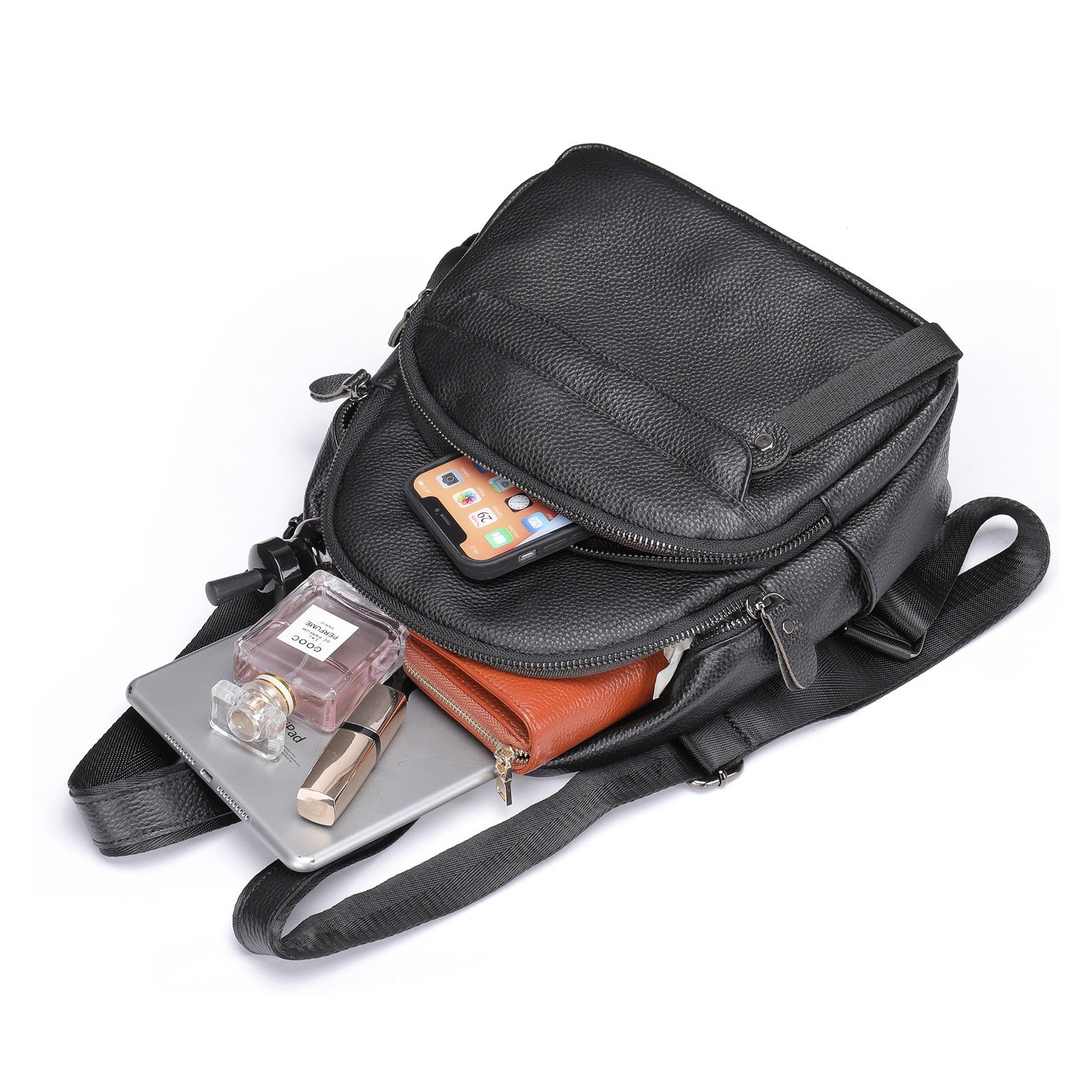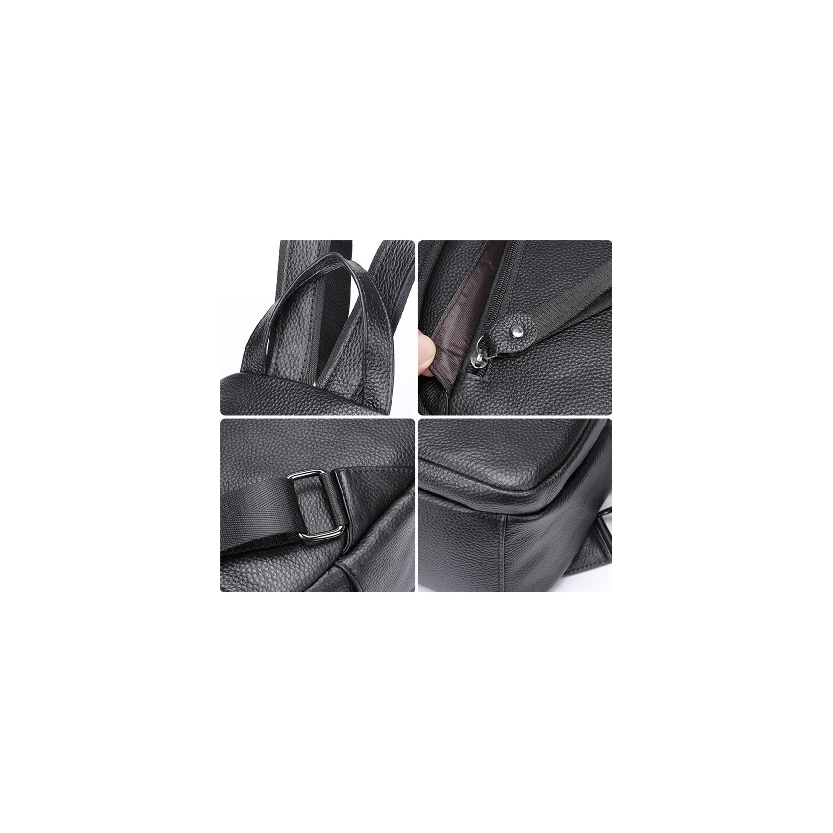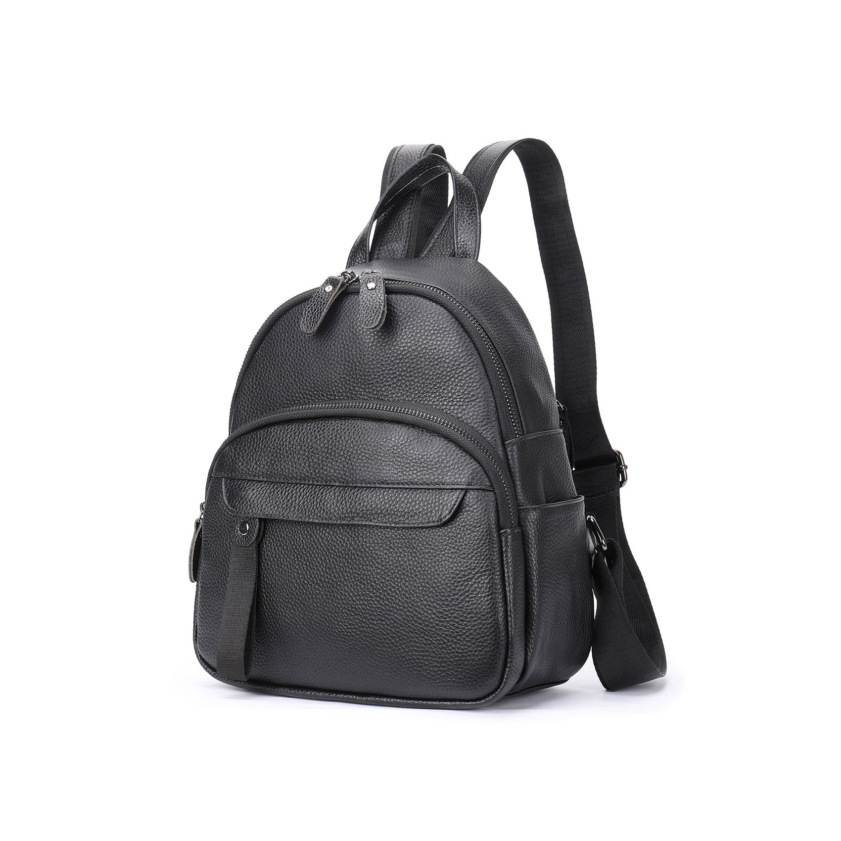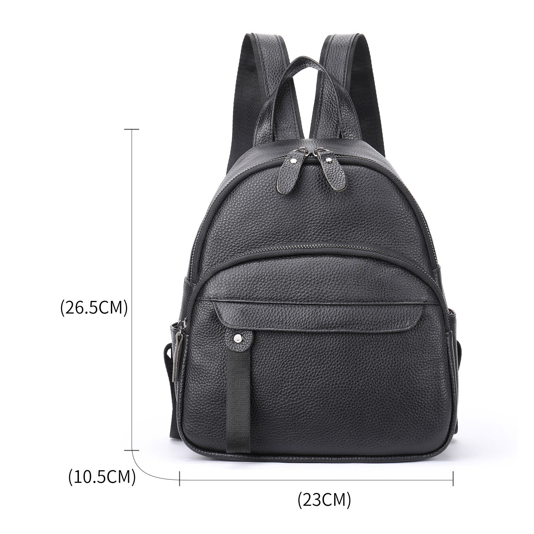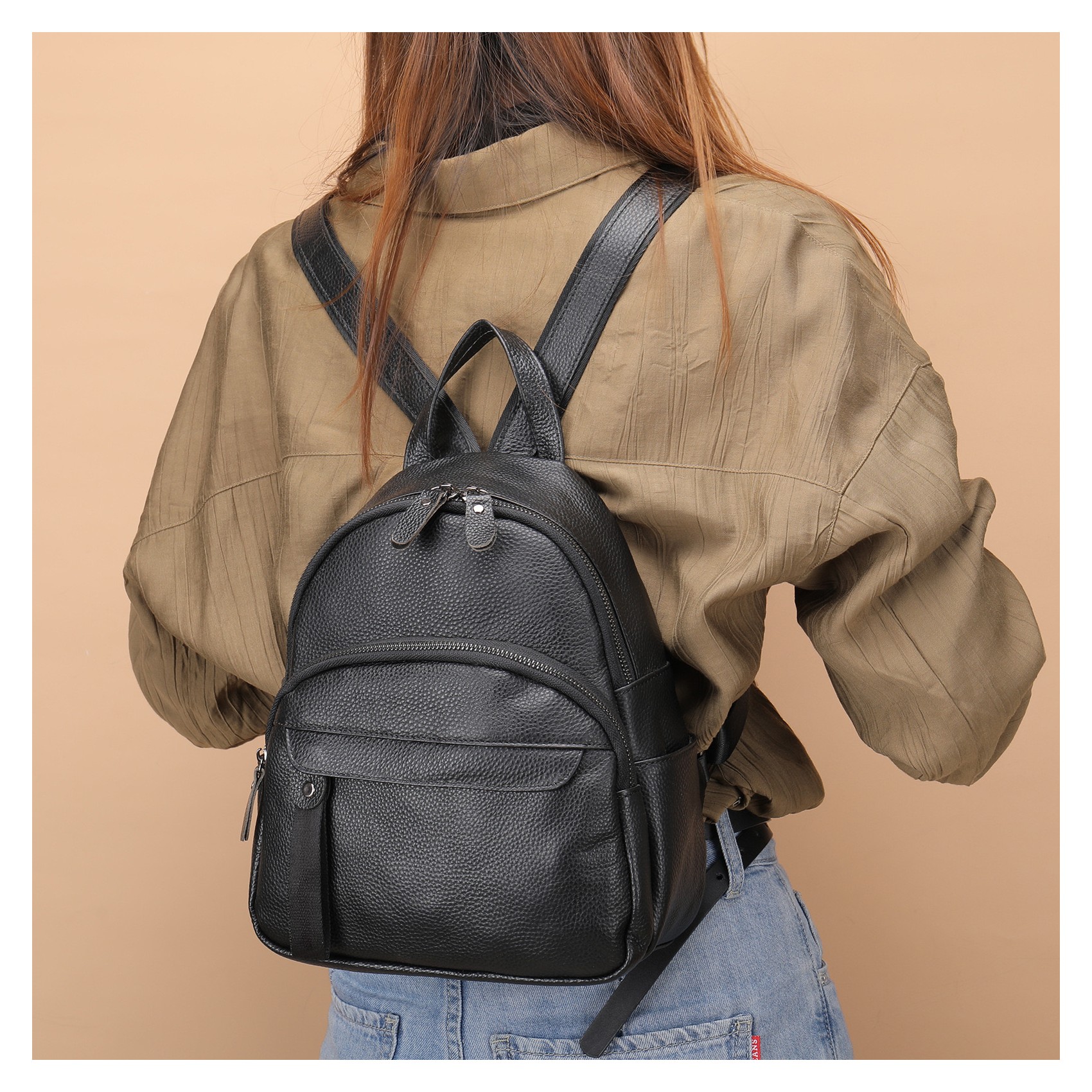 Этот женский рюкзак изготовлен из кожи, что придает ему элегантный вид и долговечность. Спереди расположены два удобных кармана на молнии, которые позволяют быстро достать необходимые вещи. Основное отделение закрывается на молнию с двумя бегунками, что обеспечивает легкий доступ к содержимому. Внутри рюкзака есть два кармана для мелочей и один на молнии, что помогает организовать пространство. На обороте рюкзака также есть карман на молнии для дополнительной безопасности. Два небольших кармана по бокам придают еще больше функциональности. Ручка-держатель на верхушке позволяет удобно носить рюкзак в руке.