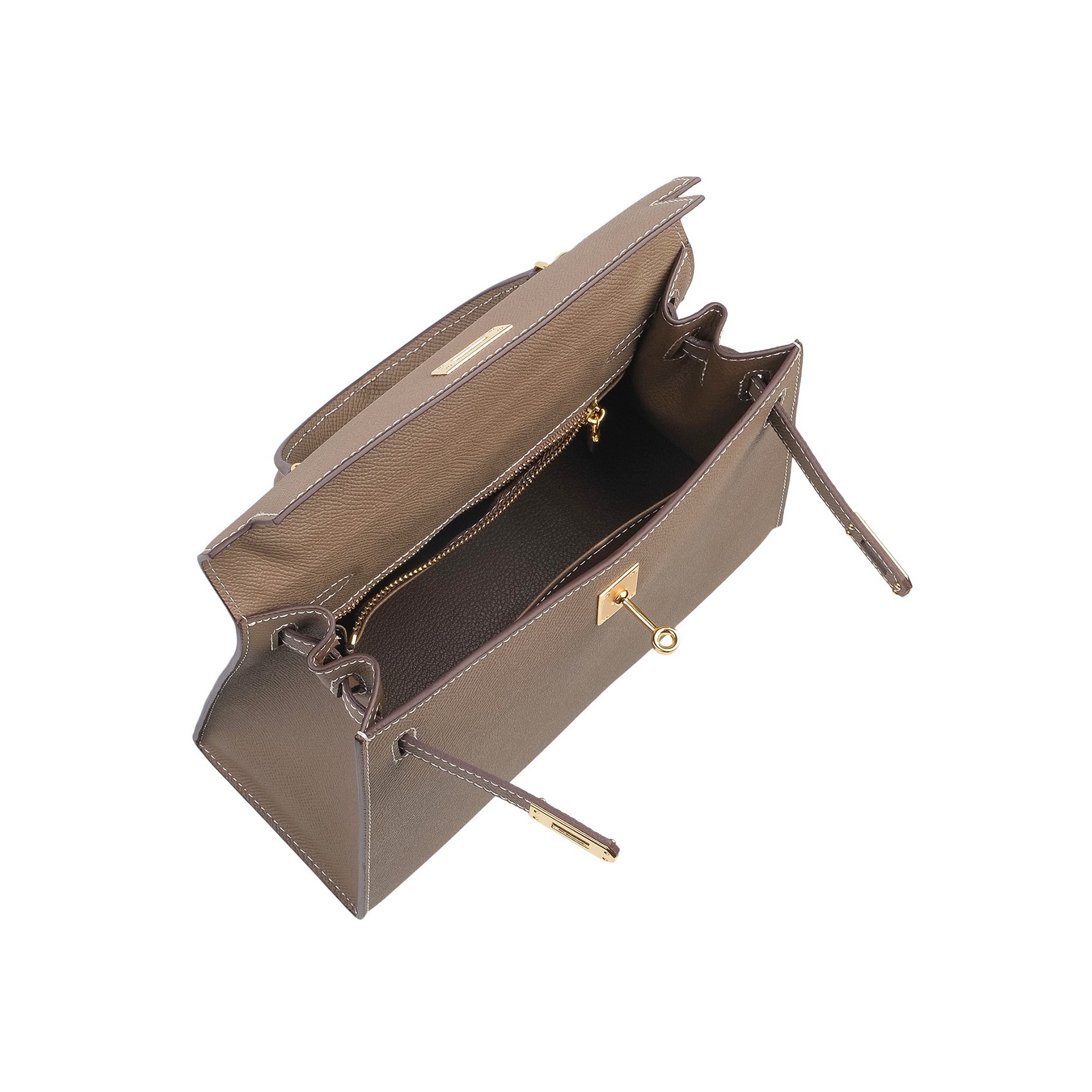 Женская сумка Kelly серо-бежевого цвета выполнена из натуральной кожи с гладкой текстурой и отличается качественной отделкой. Элегантная модель дополнена золотистой фурнитурой, включая декоративный замок, который надёжно фиксирует клапан. Компактные размеры позволяют удобно разместить повседневные вещи, а внутренние карманы обеспечивают удобную организацию хранения, включая потайной карман на молнии для документов и мелочей. Сумка оснащена съёмным ремешком, что делает её универсальной: её можно носить в руке или на плече. Этот аксессуар гармонично впишется как в деловой, так и в повседневный образ, подчёркивая вкус и стиль владелицы.