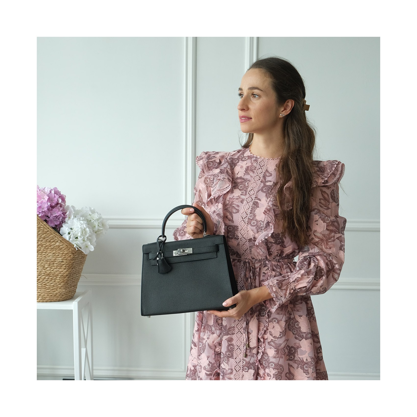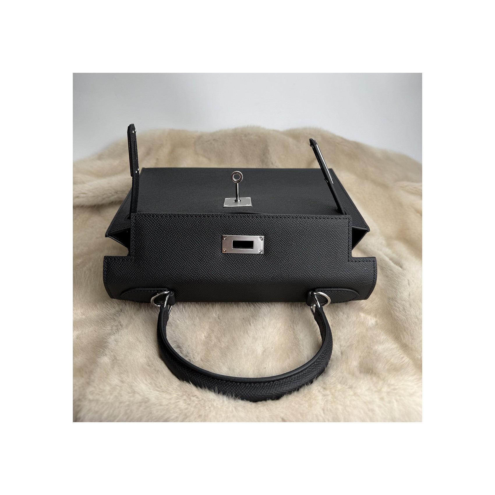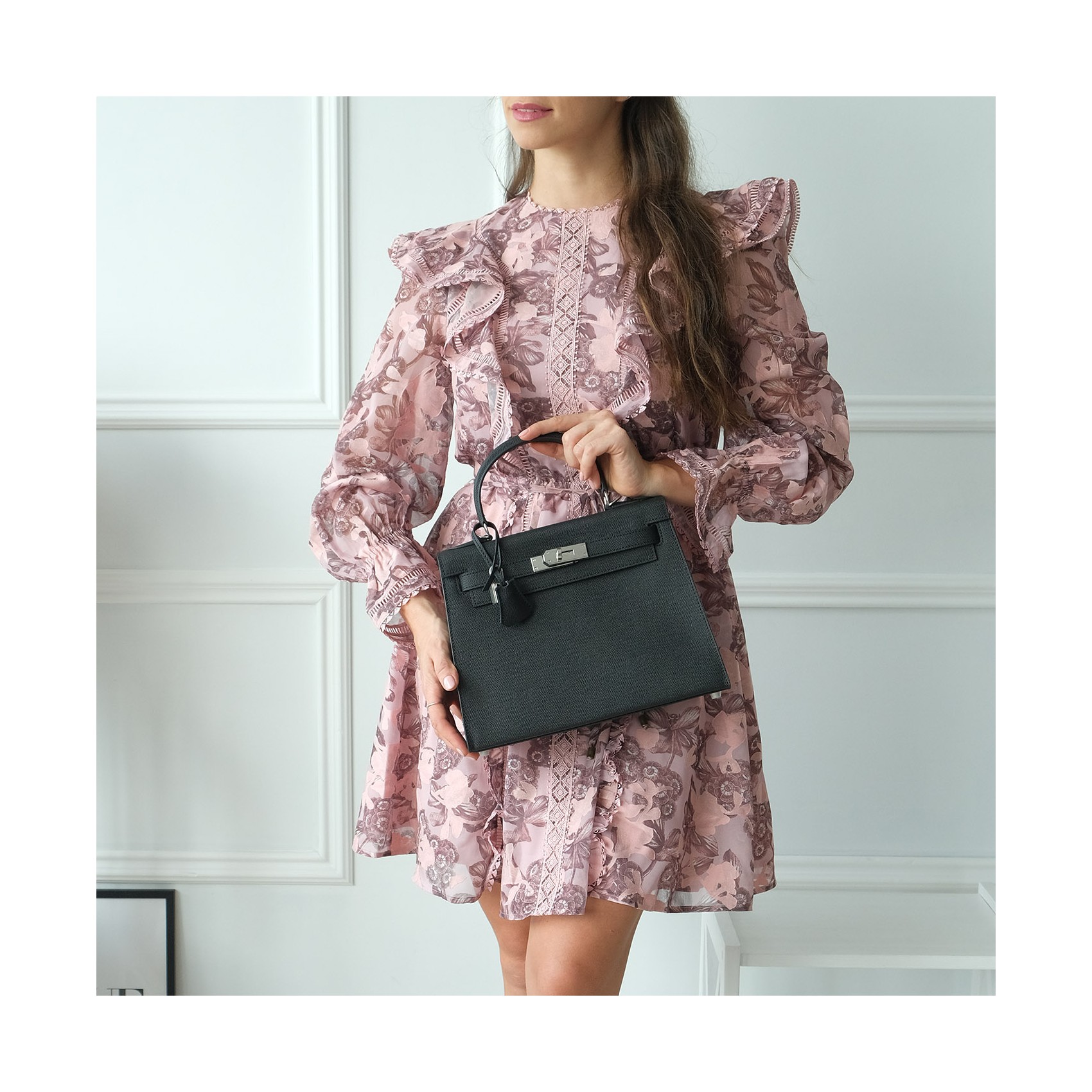 Женская сумка Kelly черного цвета выполнена из натуральной кожи с гладкой текстурой и отличается качественной отделкой. Элегантная модель дополнена серебряной фурнитурой, включая декоративный замок, который надёжно фиксирует клапан. Компактные размеры позволяют удобно разместить повседневные вещи, а внутренние карманы обеспечивают удобную организацию хранения, включая потайной карман на молнии для документов и мелочей. Сумка оснащена съёмным ремешком, что делает её универсальной: её можно носить в руке или на плече. Этот аксессуар гармонично впишется как в деловой, так и в повседневный образ, подчёркивая вкус и стиль владелицы.